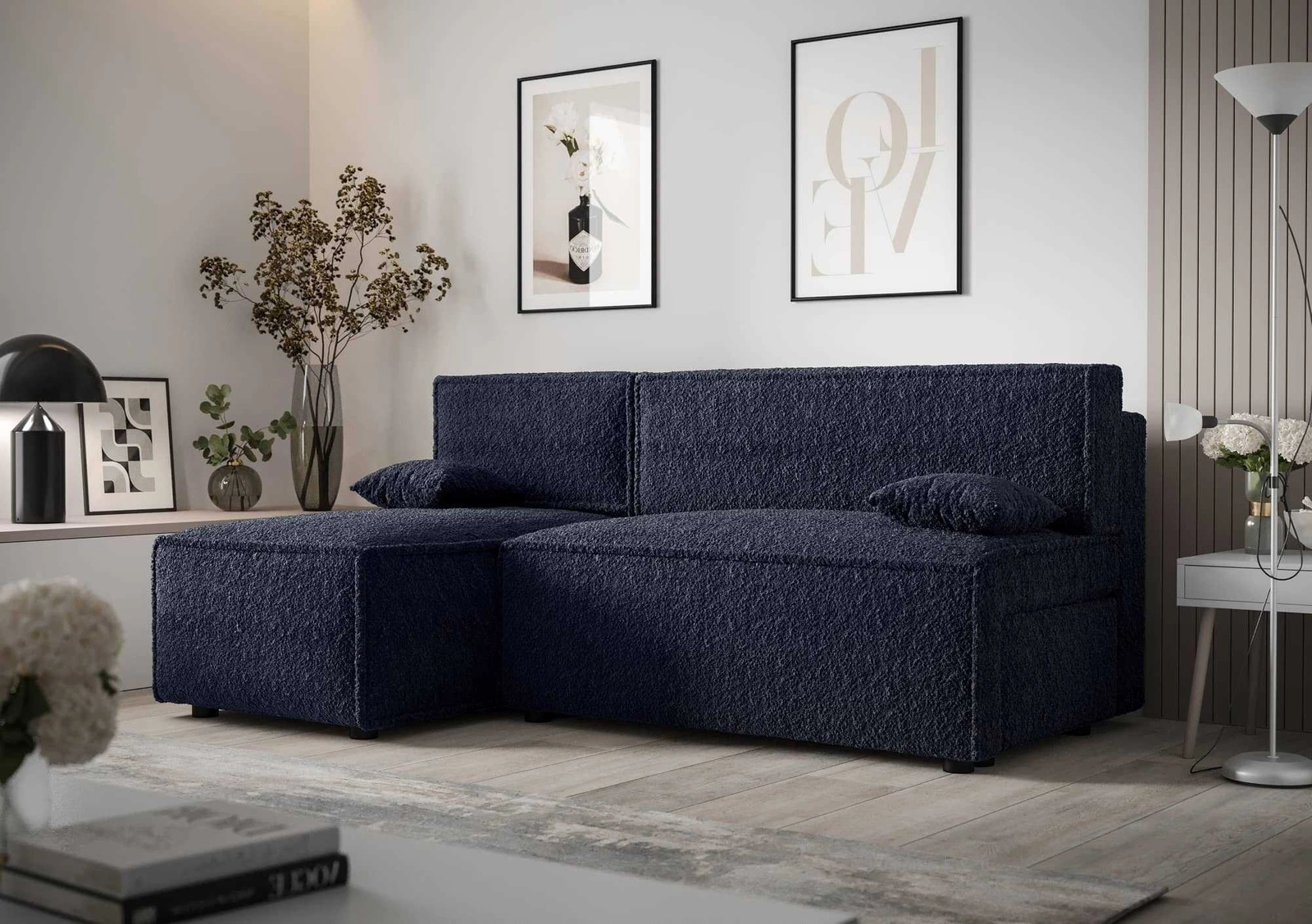 Rohová sedací souprava s funkcí spaní Brandon námořnicky modrá levý roh měkká tkanina s charakteristickou smyčkovou povrchovou nádobou na lůžkoviny
