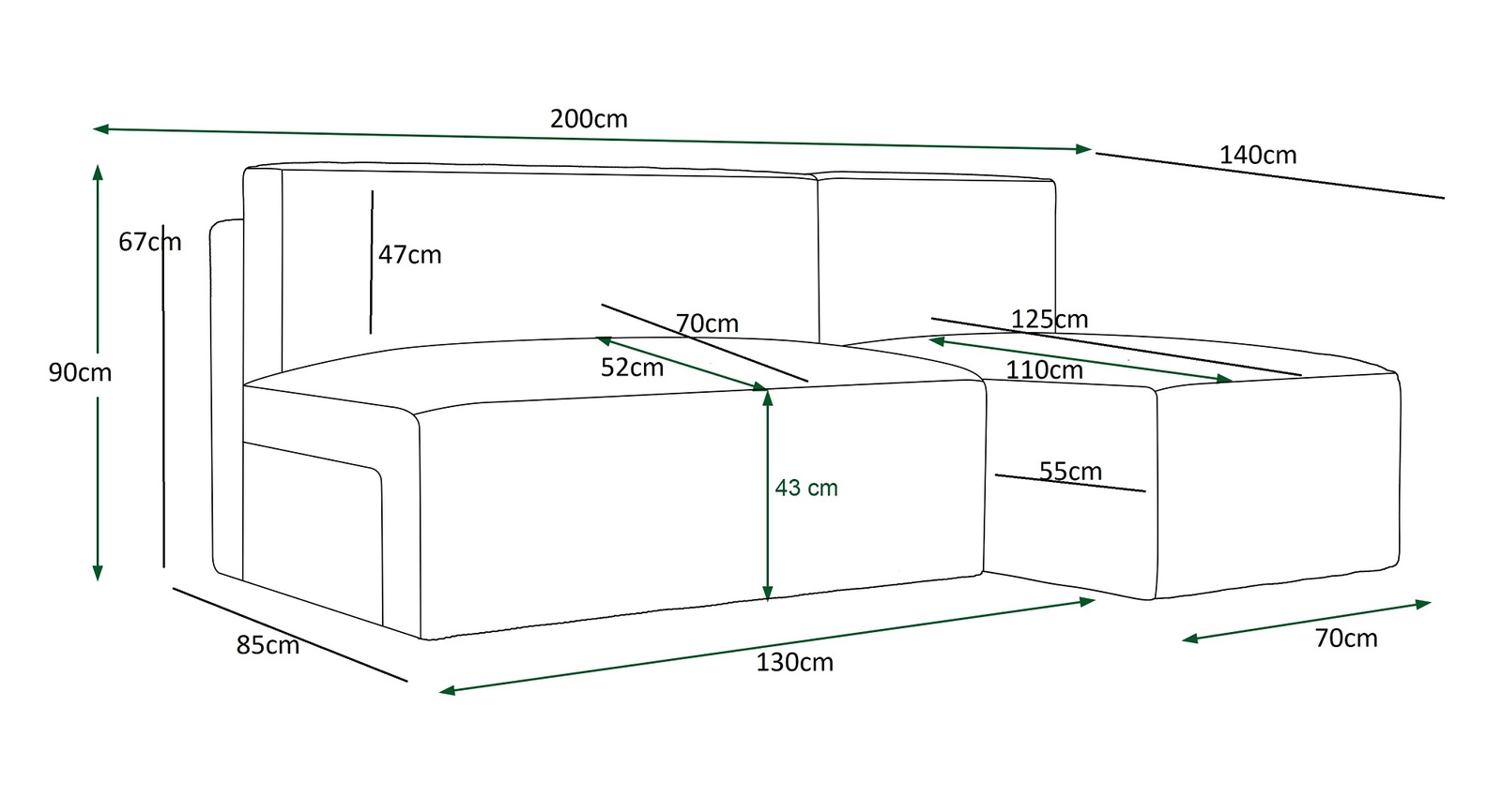 Díky svým optimálním rozměrům a široké funkčnosti je rohová pohovka s funkcí spaní ideální jako rohová pohovka do obývacího pokoje nebo jako rozkládací rohová pohovka do pokoje teenagera. Šířka rohu 200 cm, maximální výška 90 cm a hloubka 140 cm. Spací plocha rohové jednotky je 125x200 cm. Výška sedadla nábytku je 43 cm, a výška opěradla je 47 cm. Vlnité pružiny a pěna HR30 je materiál, z něhož je vyrobeno sedadlo rohu. Podpora polštáře zaručuje pohodlný odpočinek po dlouhém dni, který vy i vaši hosté oceníte při posezení na této jedinečné rohové pohovce!