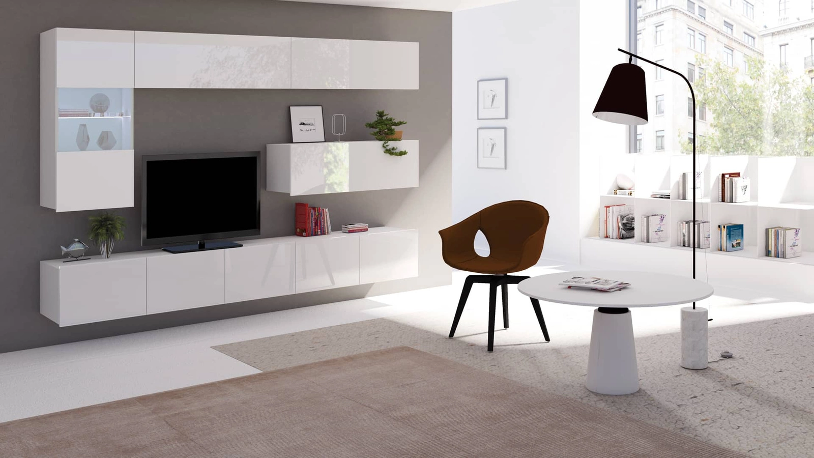 Prosklená přední část displeje umožňují vystavit dekorace do obývacího pokoje. Prostorné skříně RTV pojme veškeré příslušenství a vybavení. Subteliny převislé fronty slouží také jako rukojeť. Další výhoda skříně RTV je možnost volby způsobu jejího umístění. Skříň RTV lze zavěsit na stěnu. Díky přiloženým plastovým nožičkám je skříň RTV velmi rychlá se může stát stojícím kusem nábytku.
