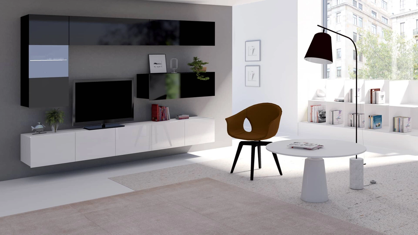 Prosklená přední část displeje umožňují vystavit dekorace do obývacího pokoje. Prostorné skříně RTV pojme veškeré příslušenství a vybavení. Subteliny převislé fronty slouží také jako rukojeť. Další výhoda skříně RTV je možnost volby způsobu jejího umístění. Skříň RTV lze zavěsit na stěnu. Díky přiloženým plastovým nožičkám je skříň RTV velmi rychlá se může stát stojícím kusem nábytku.