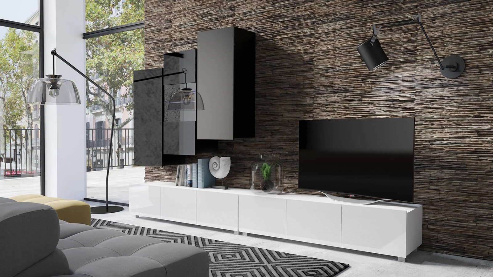Prosklená přední část displeje k vystavení dekorací do obývacího pokoje. Prostorné skříně RTV pojme veškeré příslušenství a vybavení. Subteliny převislé fronty slouží také jako rukojeť. Další výhoda skříně RTV je možnost volby způsobu jejího umístění. Skříň RTV může stát na podlaze. Díky přiloženým závěsům se skříňka RTV může rychle stát nástěnnou jednotkou se může stát nástěnnou jednotkou.