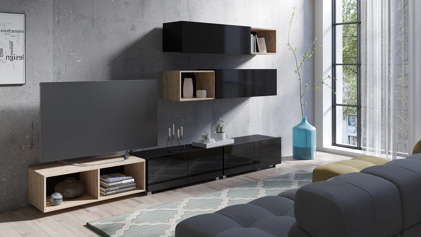 Apulia XXV černý lesk / dub artisan Výjimečně stylová nástěnná skříňka s jednoduchými nábytkovými díly, která se hodí do každého interiéru