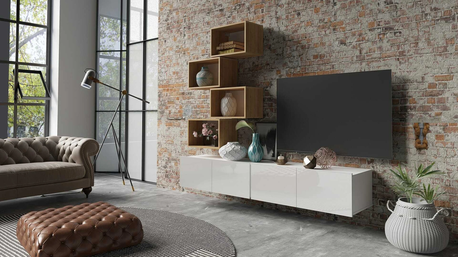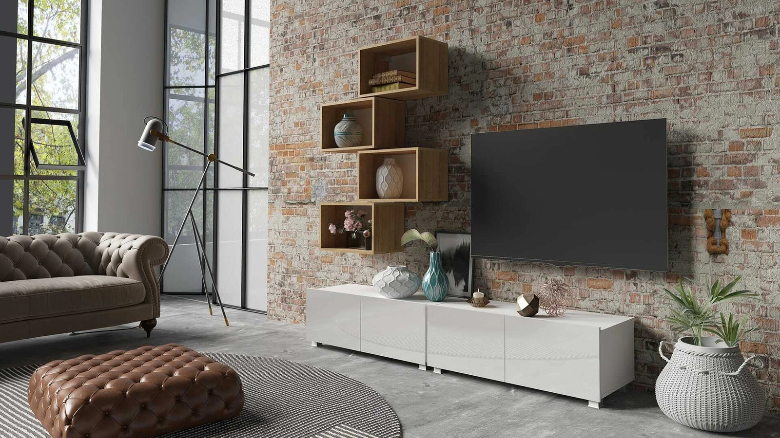 Otevřené police umožňují nenápadně vystavit dekorace do obývacího pokoje. Prostorné skříně RTV pojme veškeré příslušenství a vybavení. Subteliny převislé fronty slouží také jako rukojeť. Další výhoda skříněk RTV je možnost zvolit si způsob umístění. Skříň RTV může stát na podlaze. Díky přiloženým závěsům se skříňka RTV může rychle stát nástěnnou jednotkou se může stát nástěnnou jednotkou.