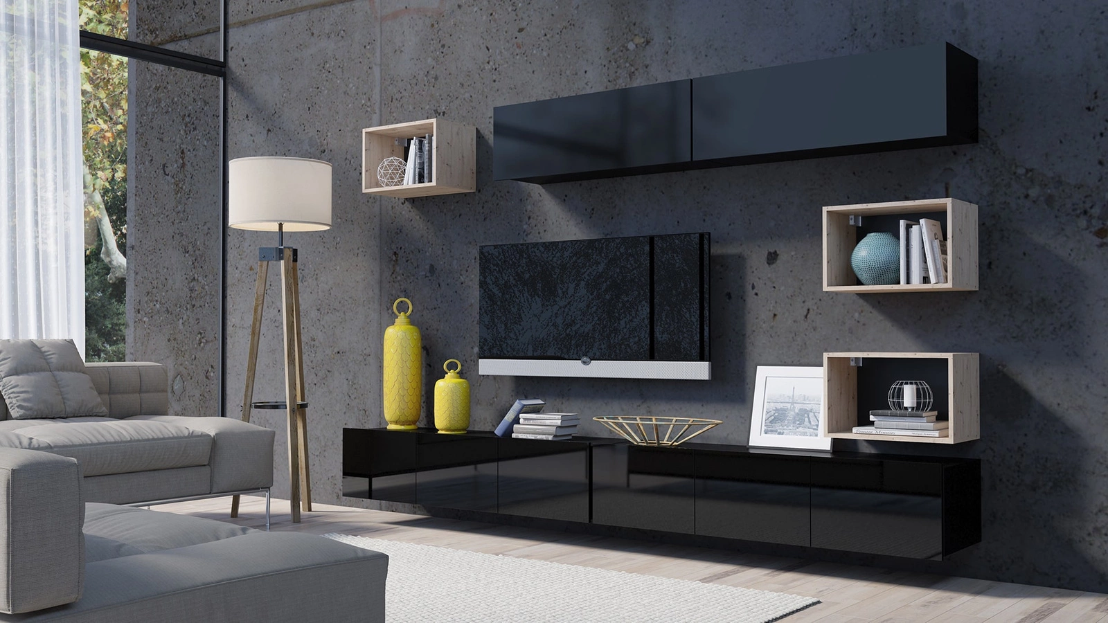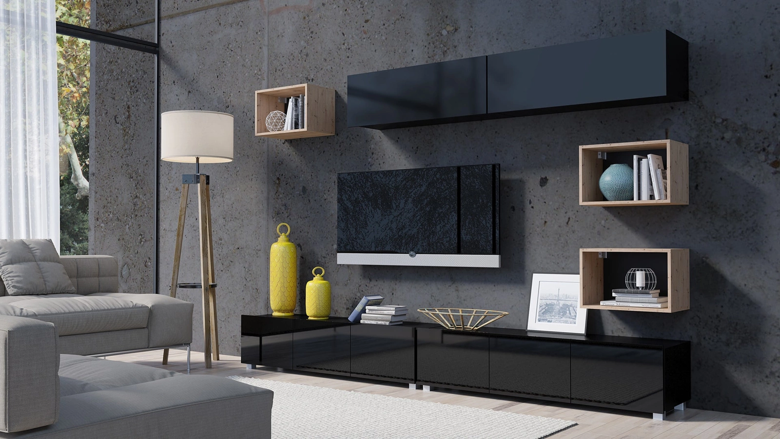 Apulia XXXI černý lesk / dub řemeslná nástěnná skříňka extrémně stylová nástěnná skříňka jednoduché jednotky hodící se do každého interiéru