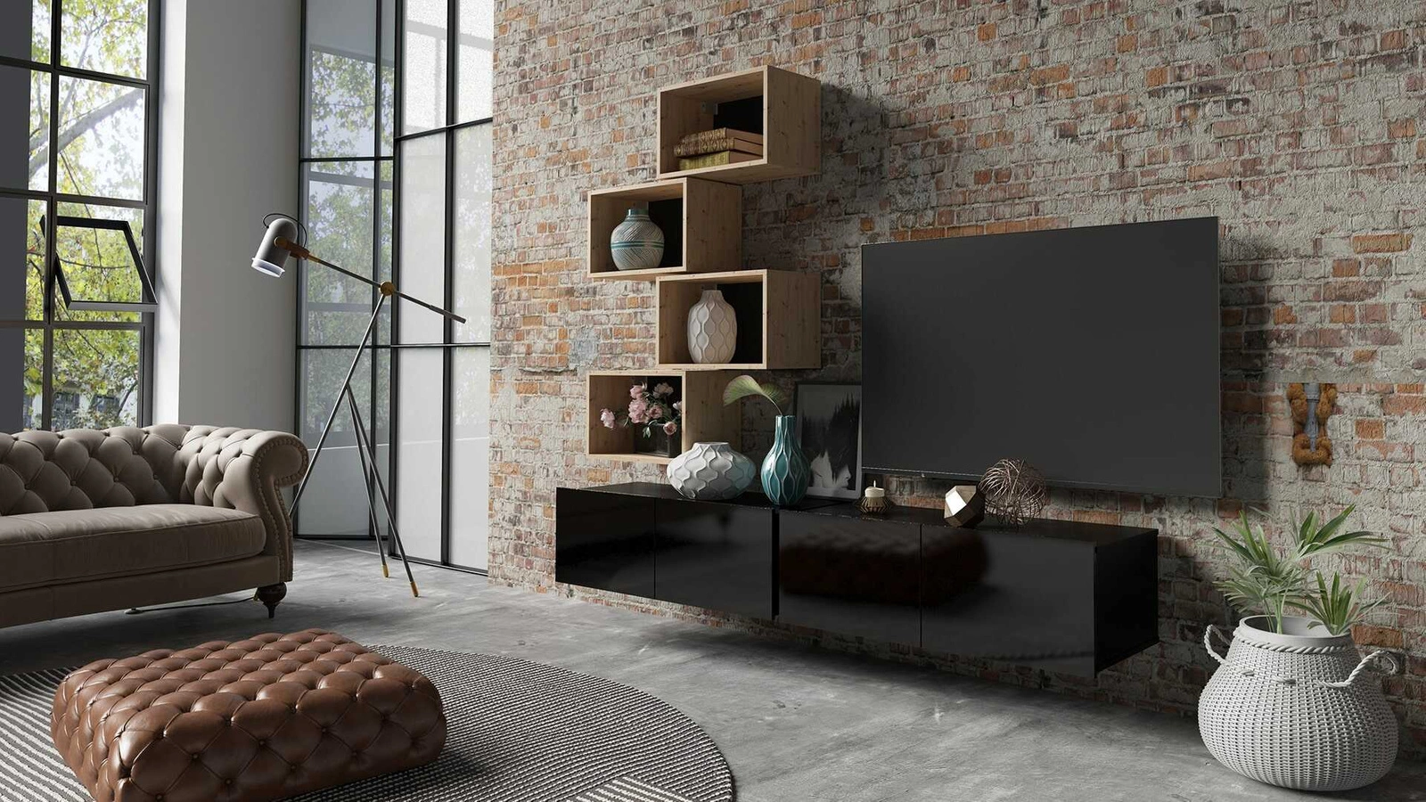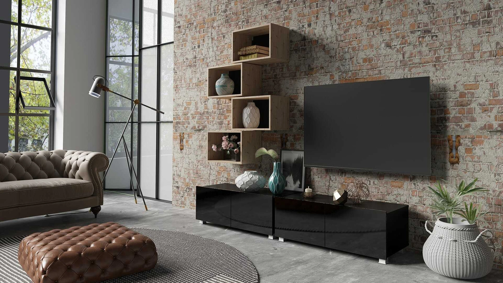Otevřené police umožňují nenápadně vystavit dekorace do obývacího pokoje. Prostorné skříně RTV pojme veškeré příslušenství a vybavení. Subteliny převislé fronty slouží také jako rukojeť. Další výhoda skříněk RTV je možnost zvolit si způsob umístění. Skříň RTV může stát na podlaze. Díky přiloženým závěsům se skříňka RTV může rychle stát nástěnnou jednotkou se může stát nástěnnou jednotkou.