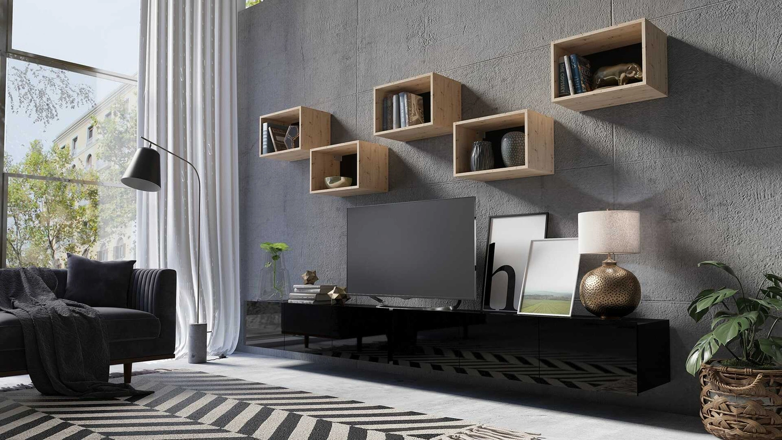 Otevřené police umožňují nenápadně vystavit dekorace do obývacího pokoje. Prostorné skříně RTV pojme veškeré příslušenství a vybavení. Subteliny převislé fronty slouží také jako rukojeť. Další výhoda skříněk RTV je možnost zvolit si způsob umístění. Skříň RTV může stát na podlaze. Díky přiloženým závěsům se skříňka RTV může rychle stát nástěnnou jednotkou se může stát nástěnnou jednotkou.
