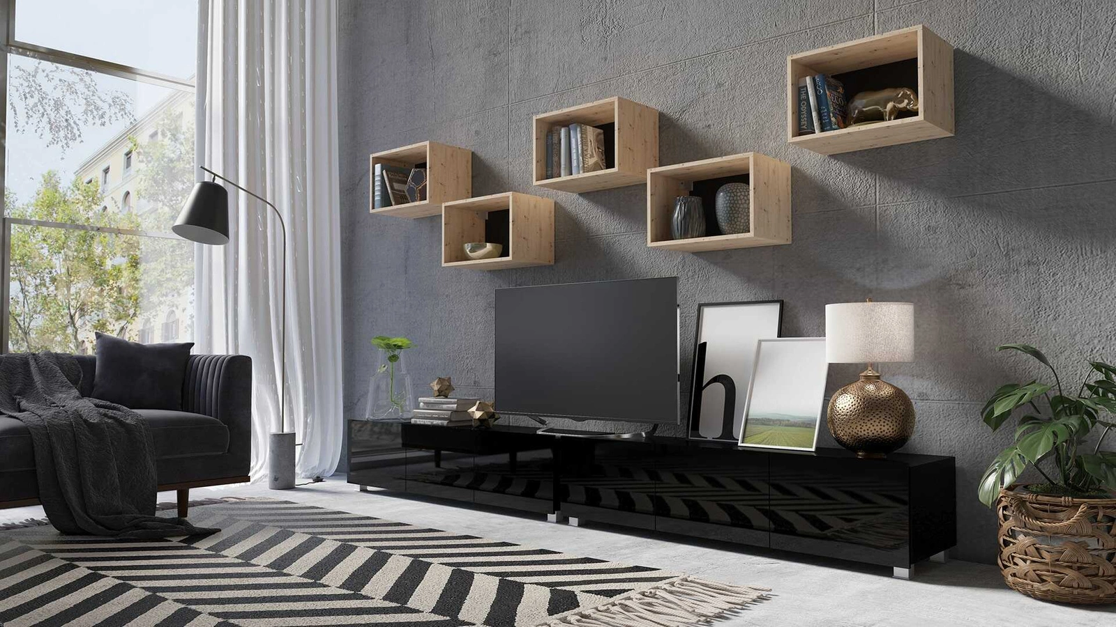 Apulia XXXII černý lesk / dub artisan Výjimečně stylová nástěnná skříňka s jednoduchými nábytkovými díly, která se hodí do každého interiéru