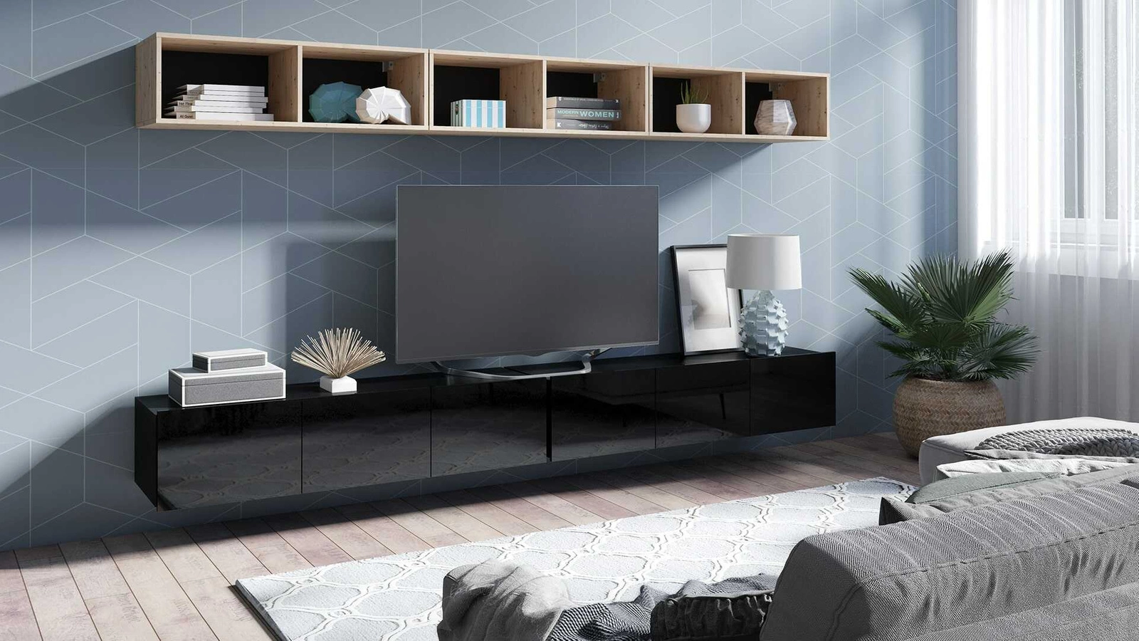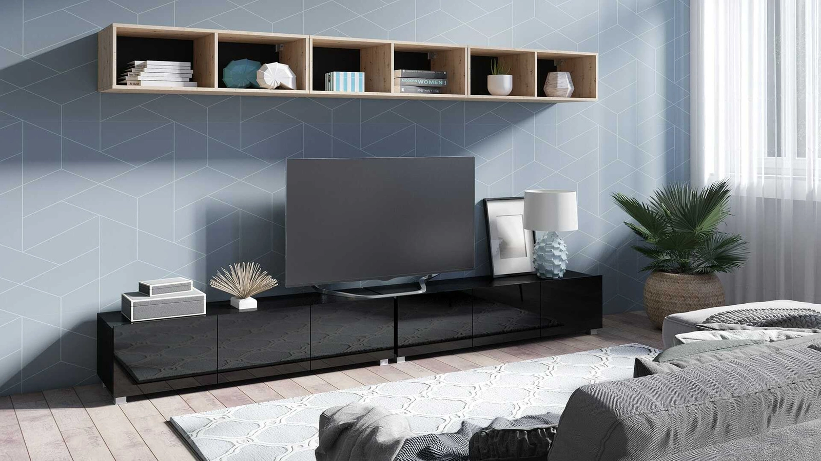 Otevřené police umožňují nenápadně vystavit dekorace do obývacího pokoje. Prostorné skříně RTV pojme veškeré příslušenství a vybavení. Subteliny převislé fronty slouží také jako rukojeť. Další výhoda skříněk RTV je možnost zvolit si způsob umístění. Skříň RTV může stát na podlaze. Díky přiloženým závěsům se skříňka RTV může rychle stát nástěnnou jednotkou se může stát nástěnnou jednotkou.
