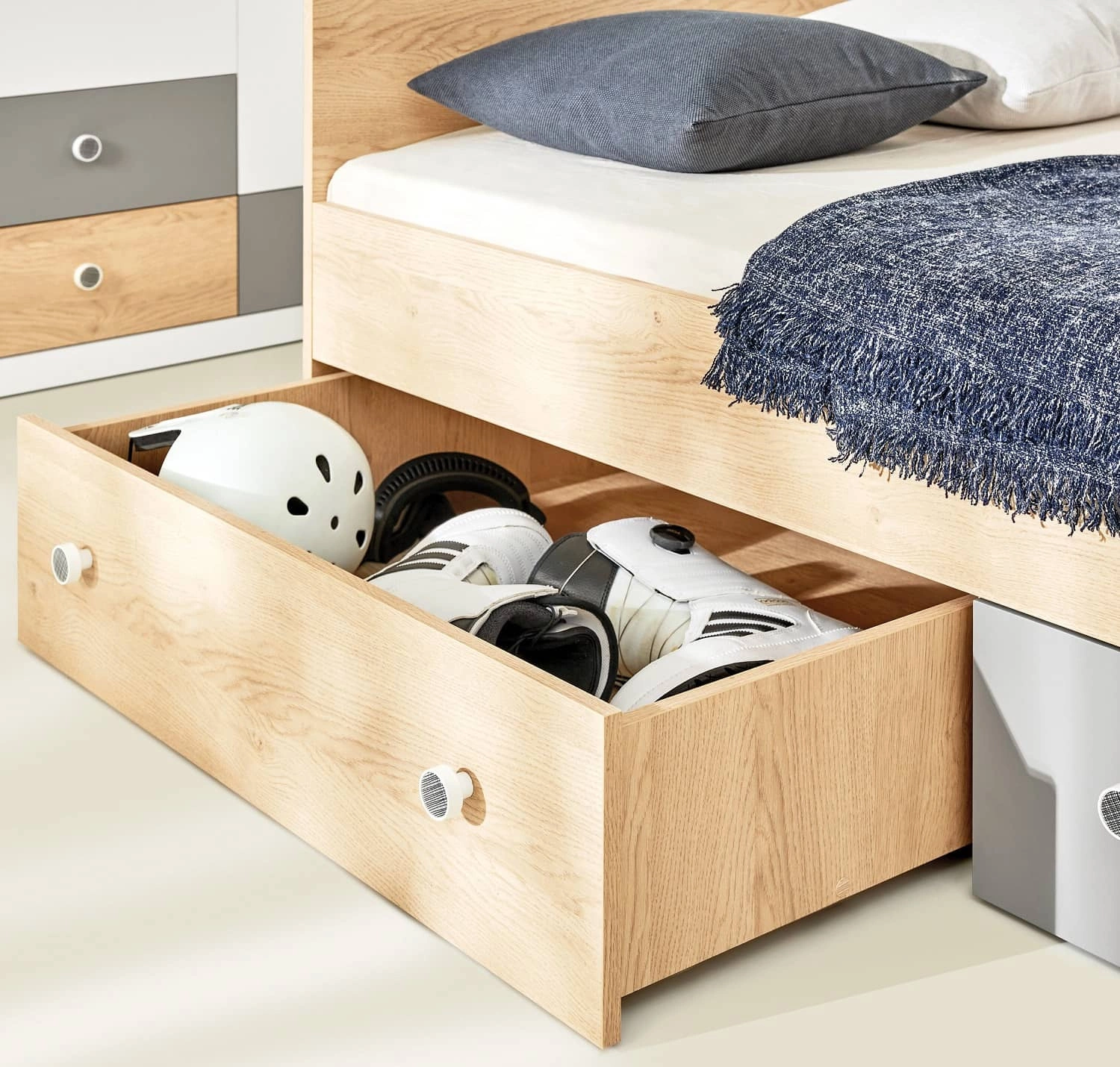Postel Pixel 90x200 cm se zásuvkami v barvě dub biskvit / bílá / šedá je receptem na moderní a funkční interiér v pokoji teenagera.