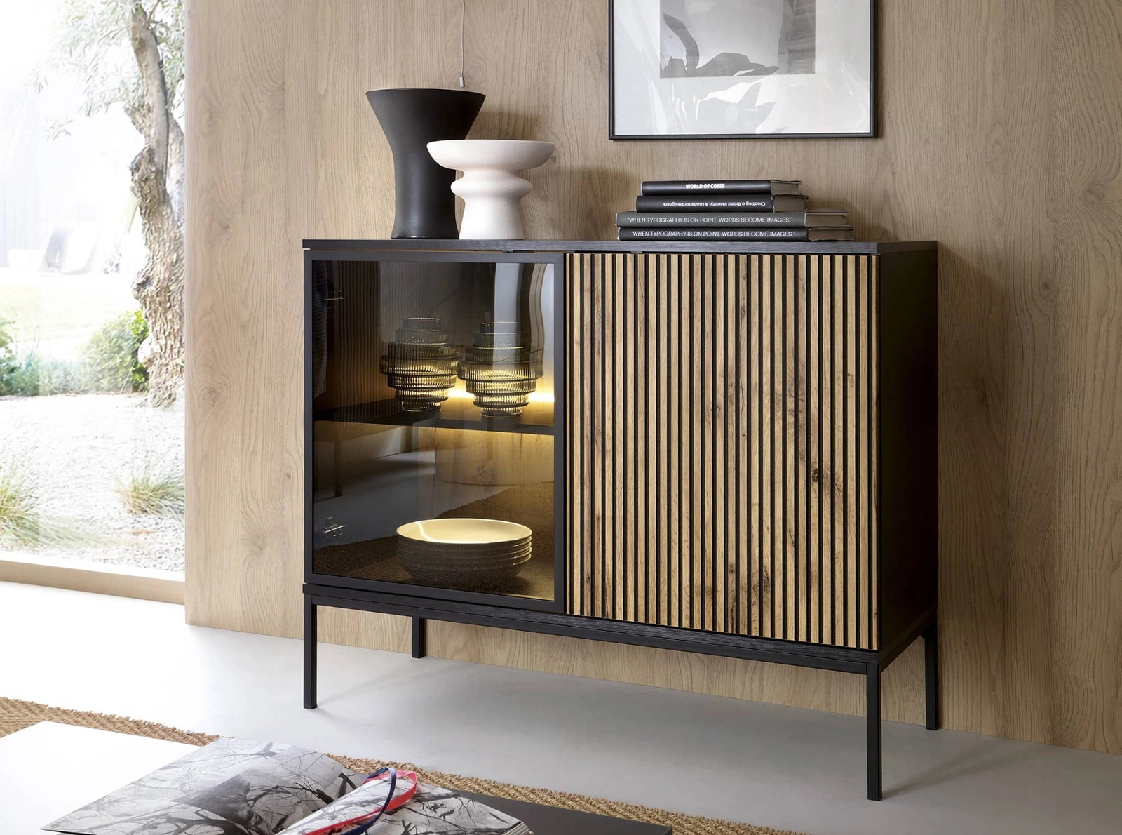 Amma 104 cm komoda černá / dub wotan netradiční design drážkovaná a prosklená čela se systémem otevírání push to open
