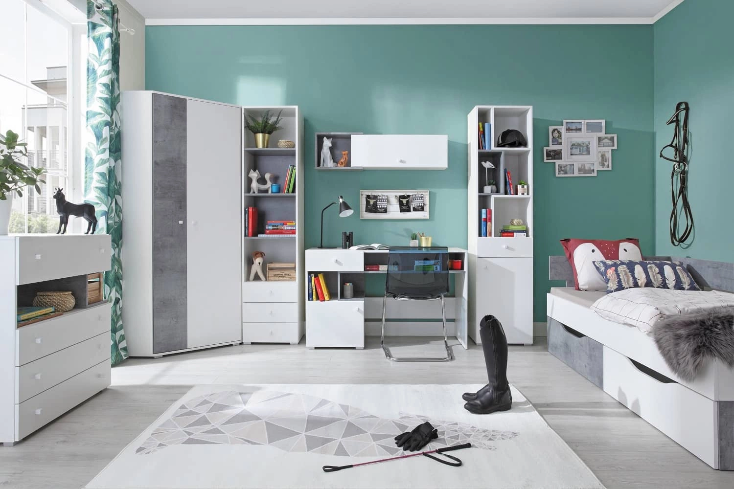 Knihovna Epsilon v barvě bílá / beton je receptem na moderní a funkční interiér v pokoji teenagera.