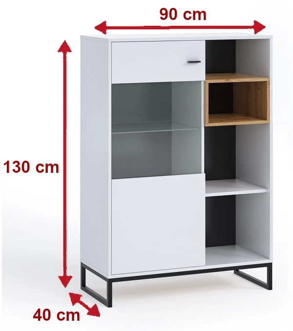 Zobrazovací jednotka je vyrobena z 1 dveře. Vitrínové dveře jsou vybaveny závěsy se systémem jemného zavírání. Použitý systém zvyšuje komfort a bezpečnost nábytku. Vitrína je vyrobena z vysoce kvalitní laminovaná deska tloušťka 16 mm, která je odolná vůči vnějším vlivům, jako jsou otlaky, nárazy a nešťastné škrábance.