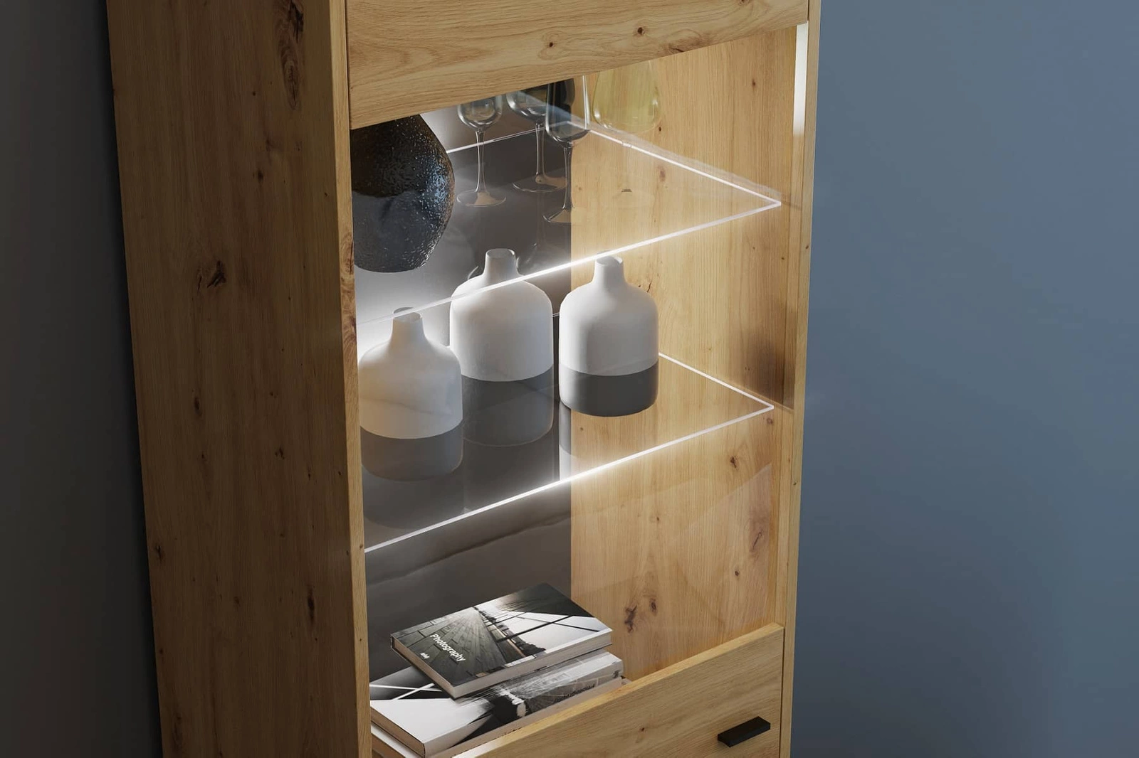 Zobrazovací jednotka je vyrobena z 1 dveře. Vitrínové dveře jsou vybaveny závěsy se systémem jemného zavírání. Použitý systém zvyšuje komfort a bezpečnost nábytku. Vitrína je vyrobena z vysoce kvalitní laminovaná deska tloušťka 16 mm, která je odolná vůči vnějším vlivům, jako jsou otlaky, nárazy a nešťastné škrábance.