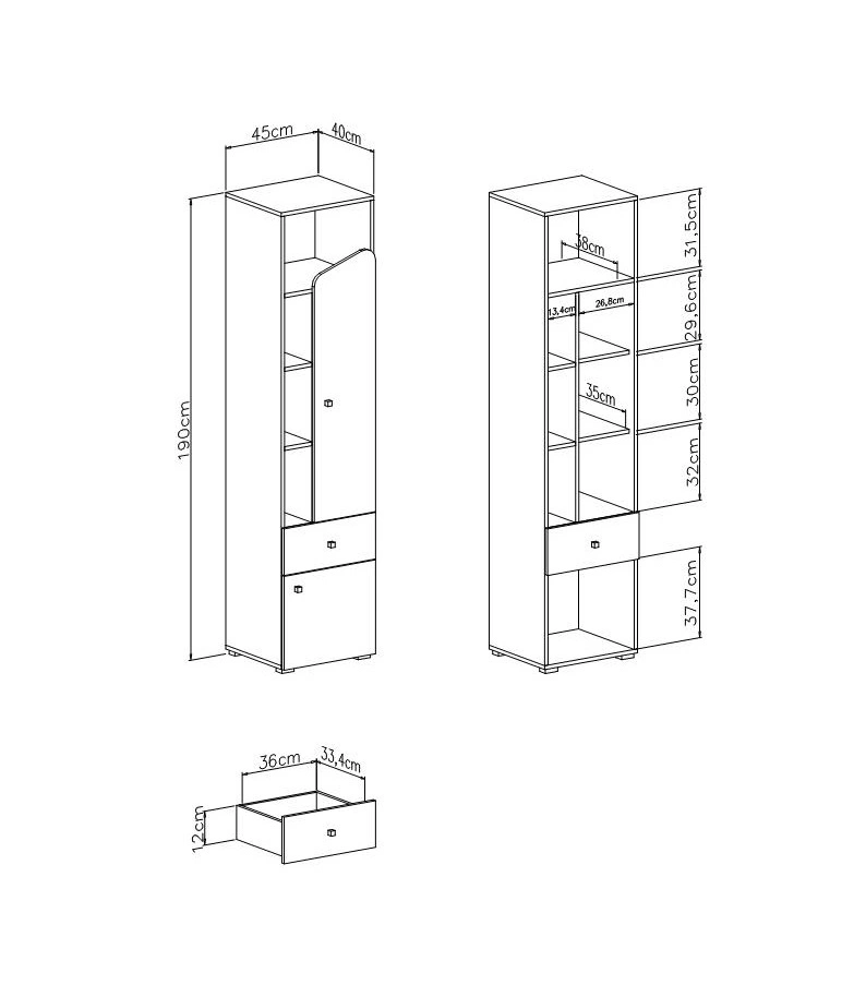 Šířka 45 cm, výška 190 cm a hloubka 40 cm aby se knihovna hodila do jakéhokoli typu místnosti! Police zaručuje pohodlné a bezproblémové používání a trvanlivost celého nábytku po mnoho let používání. Knihovna Dzeta se skvěle hodí jako knihovna do pokoje pro mladé.