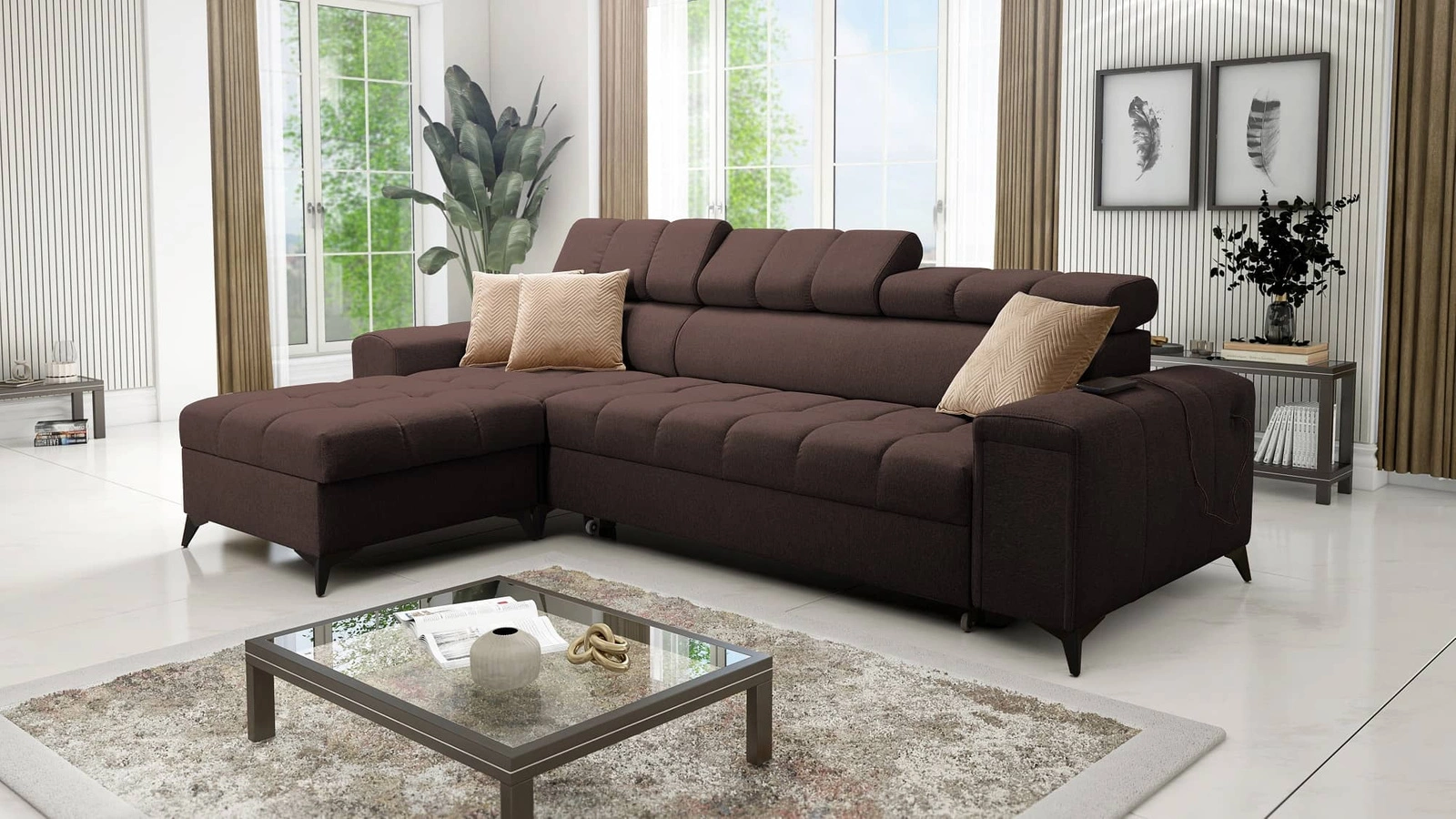 Rohová pohovka Bolmso v hnědé barvě s nastavitelnými opěrkami hlavy je nádherný kus nábytku se zárukou nejvyššího pohodlí a funkčnosti.