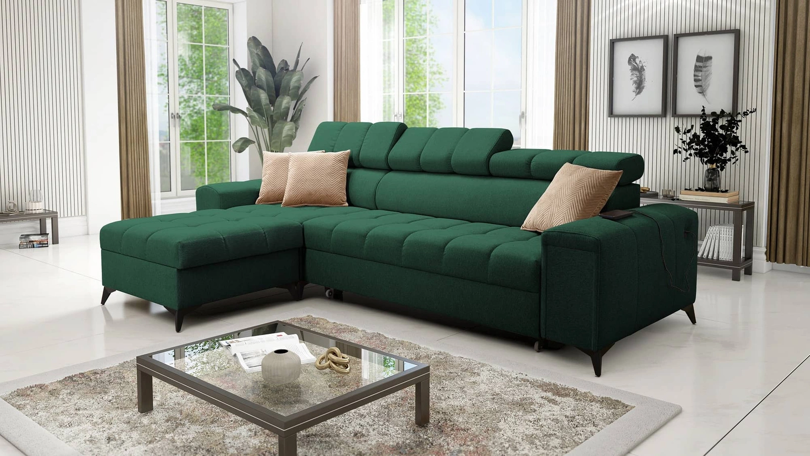 Rohová pohovka Bolmso v zelené barvě s nastavitelnými opěrkami hlavy je nádherný kus nábytku se zárukou nejvyššího pohodlí a funkčnosti.