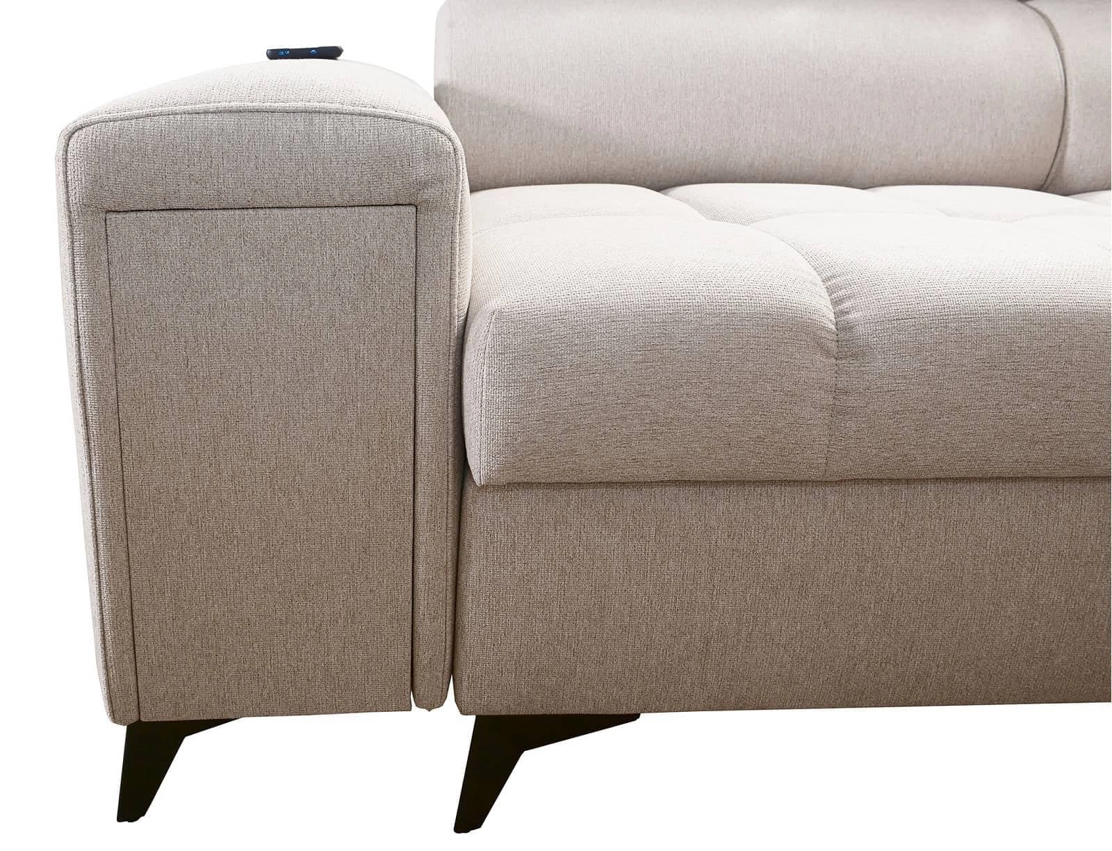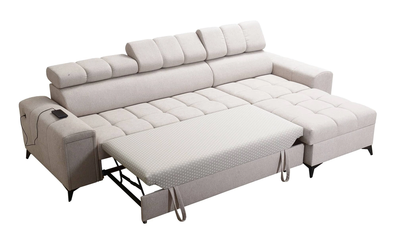 Mezi další vlastnosti tohoto nábytku, které ocení všichni uživatelé, patří dva kontejnery na lůžkoviny, funkce spaní, nabíjecí zásuvka USB v boční části rohové skříně a zásuvka s plnovýsuvným systémem v boční části nábytku.