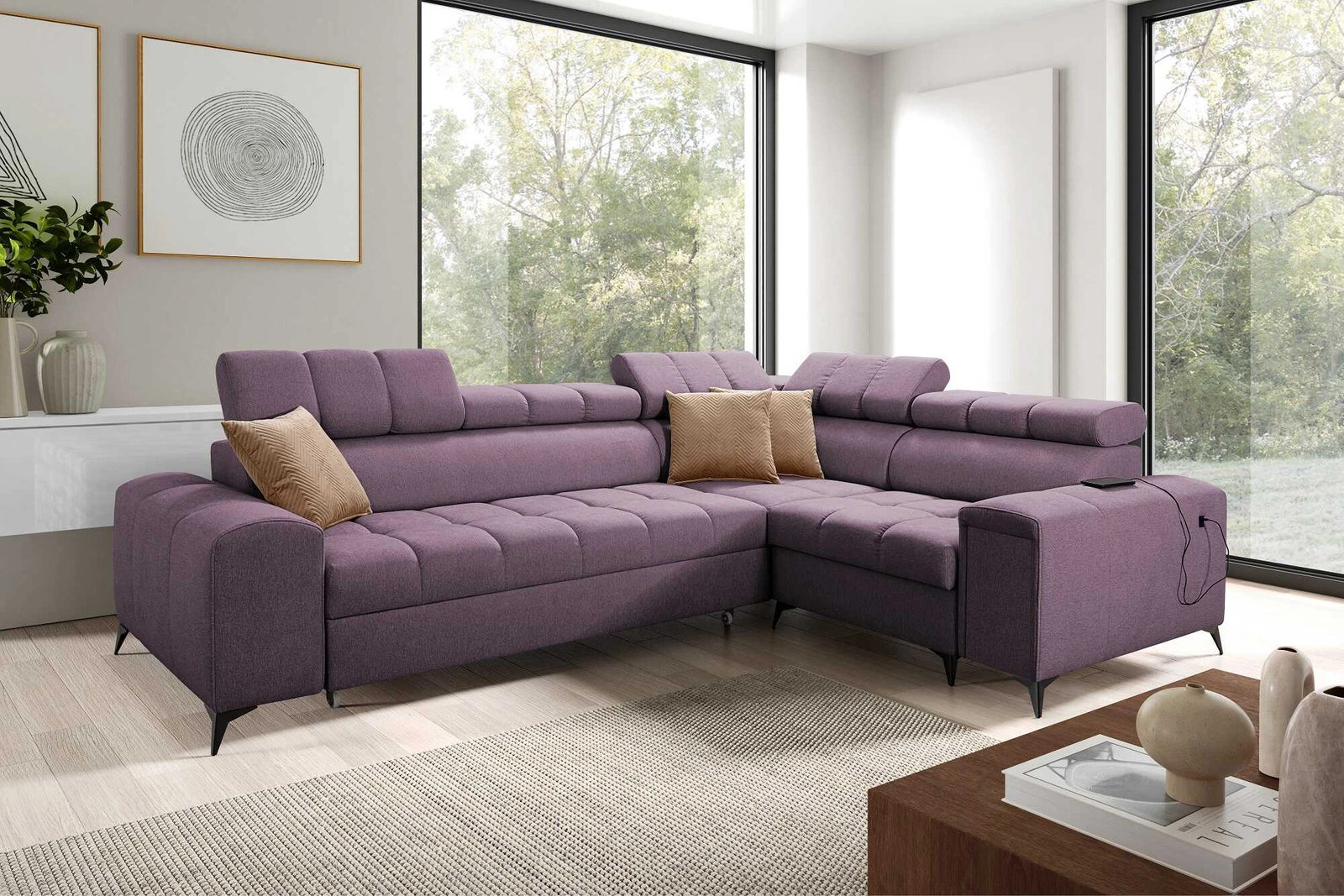 Rohová sedací souprava s funkcí spaní Bolmso II fialová pravá rohová sedací souprava s kontejnerem na ložní prádlo s plnovýsuvnou zásuvkou v boční části nábytku