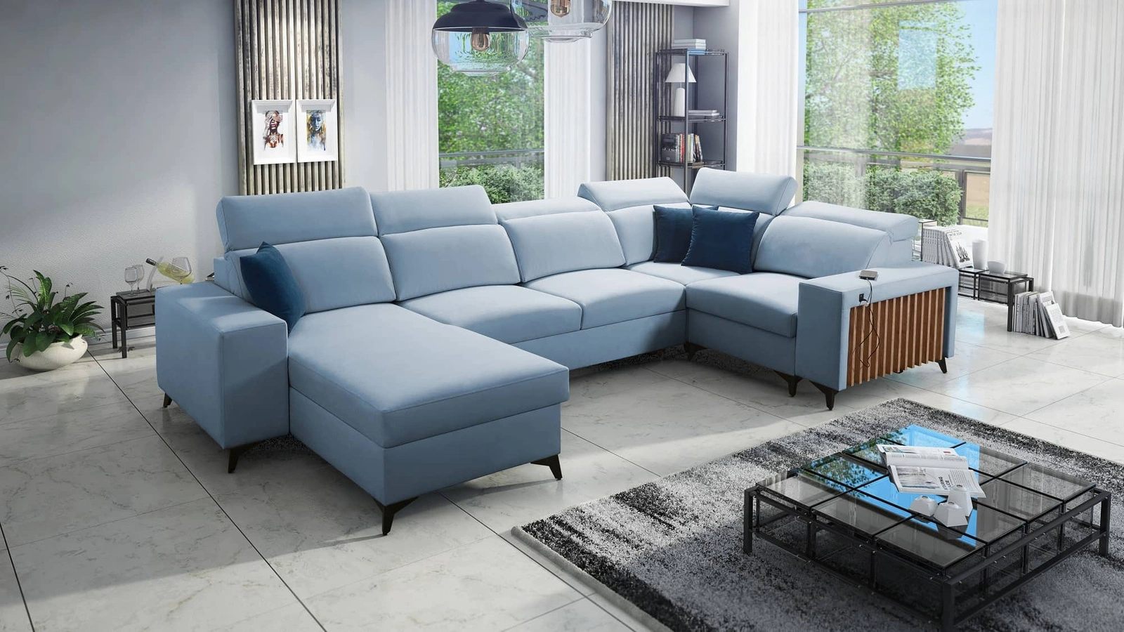 Mezi doplňky tohoto nábytku, které ocení všichni uživatelé, patří dva kontejnery na lůžkoviny, funkce spaní, nabíjecí zásuvka USB v boční části rohu pro nabíjení telefonu a dalších multimediálních zařízení.