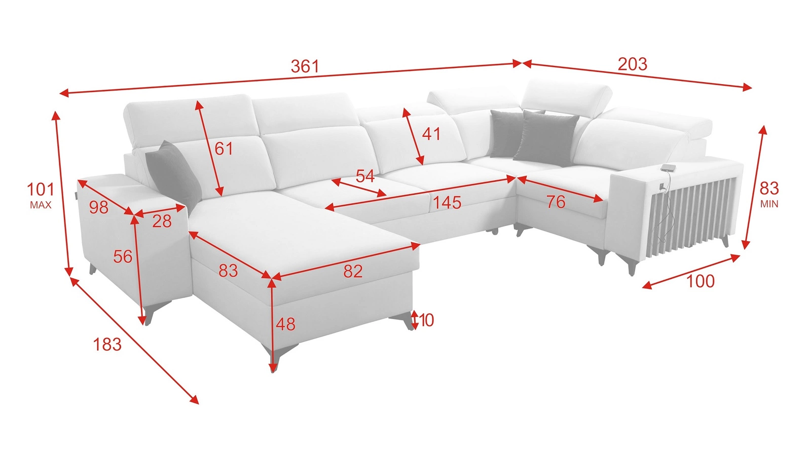 Šířka rohu 361 cm, maximální výška 101 cm a hloubka 203 cm. Spací plocha rohové jednotky je 122x283 cm. Výška sedadla nábytku je 48 cm a maximální výška opěradla je 61 cm. Vlnité pružiny a polyuretanová pěna T30 je materiál, z něhož je vyrobeno sedadlo rohu. Pevné opěradlo s nastavitelnými opěrkami hlavy zaručuje pohodlný odpočinek po dlouhém dni, který ocení všichni, kdo se na tuto výjimečnou rohovou sedačku posadí! Rohová jednotka je vyrobena z vysoce kvalitních materiálů, které jsou odolné vůči vnějším vlivům, jako je čalounění nábytku a různé druhy nárazů.