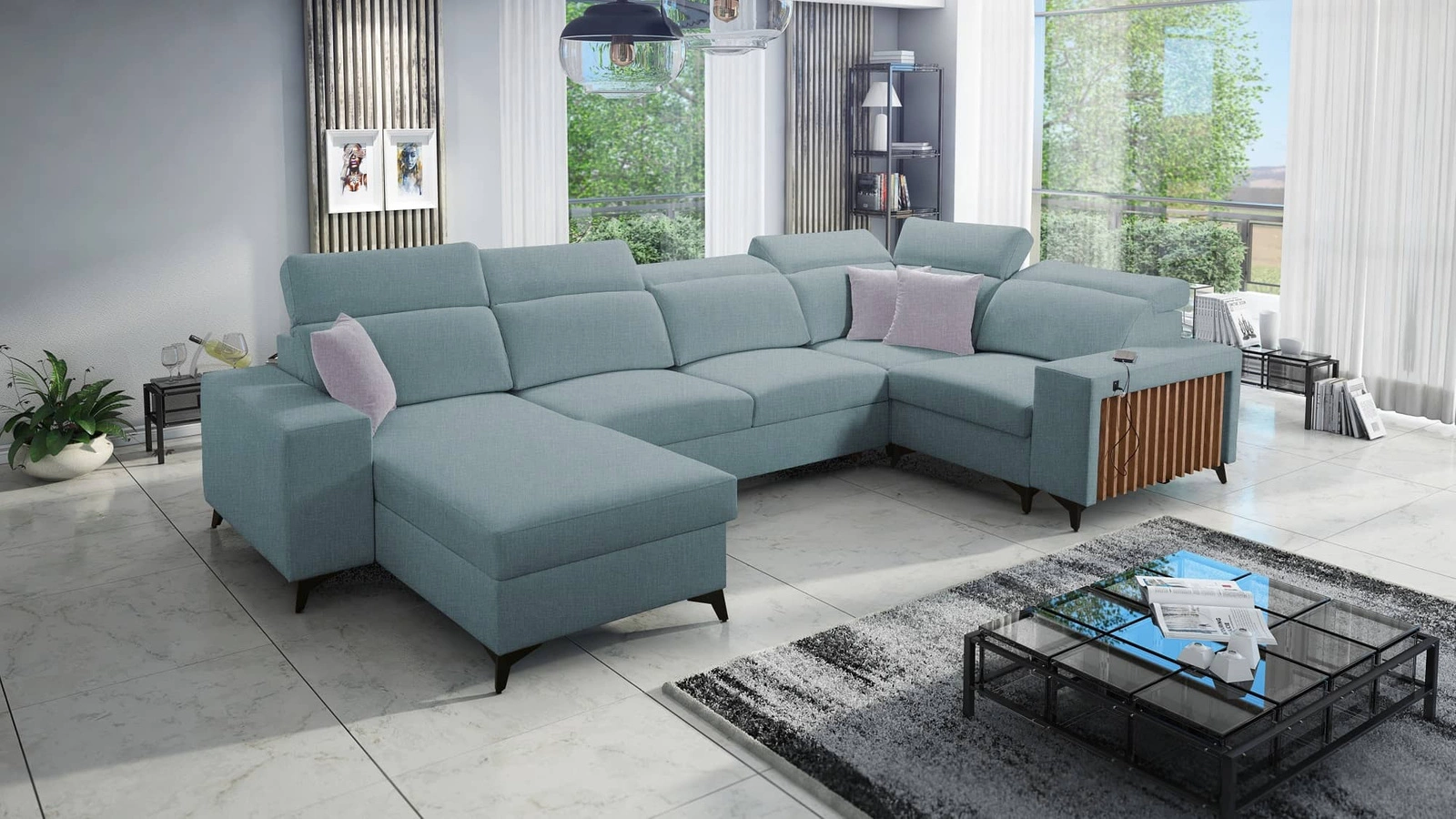 Rohová pohovka Kelly IV v arktické modři s nastavitelnými opěrkami hlavy je zajímavě vypadající kus nábytku se zárukou nejvyššího pohodlí a funkčnosti.