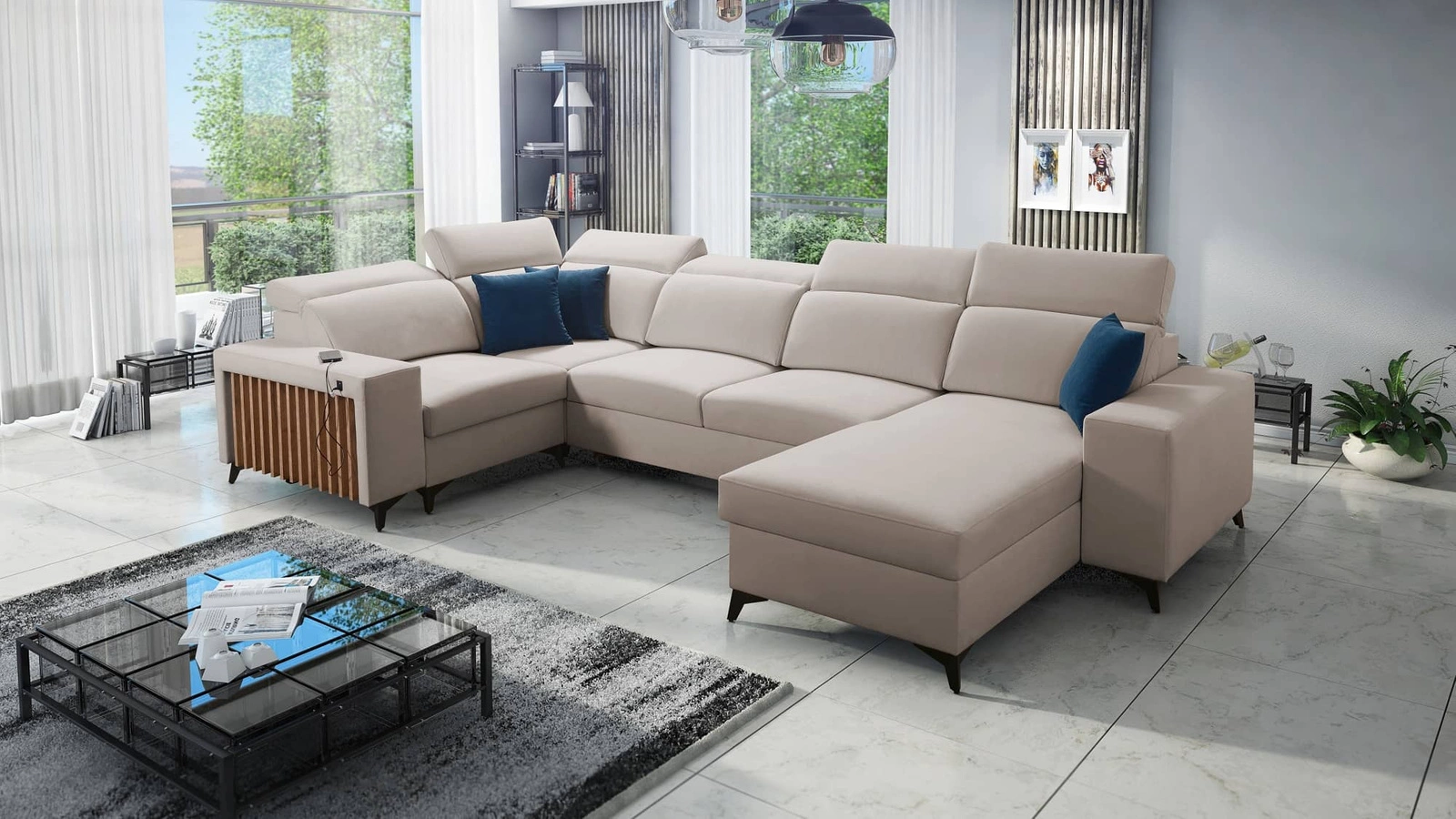 Mezi doplňky tohoto nábytku, které ocení všichni uživatelé, patří dva kontejnery na lůžkoviny, funkce spaní, nabíjecí zásuvka USB v boční části rohu pro nabíjení telefonu a dalších multimediálních zařízení.