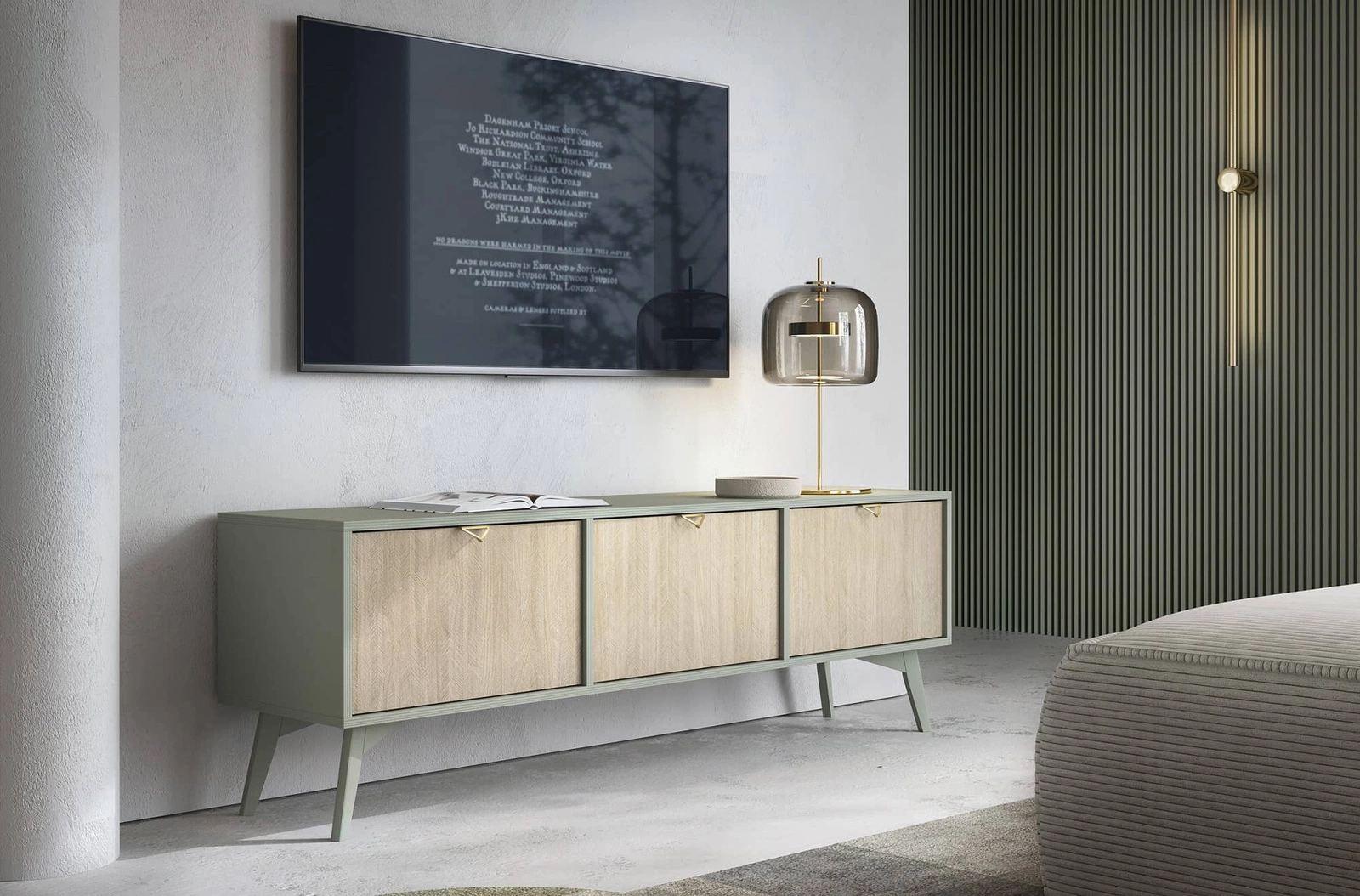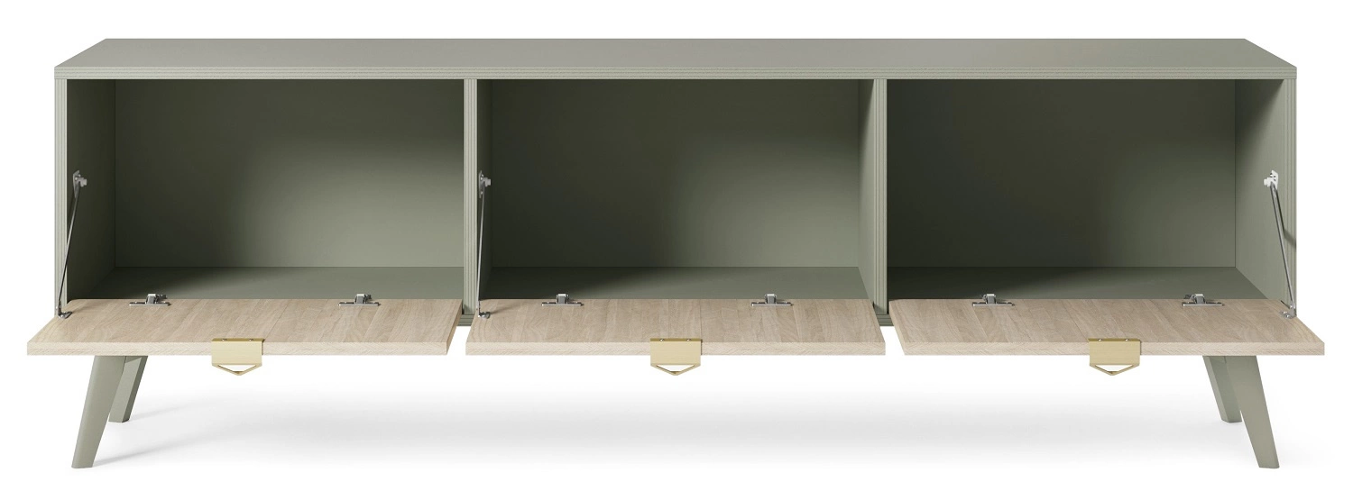 Skříňka Wald RTV v barvě eukalyptus / béžová rybí kost je originální kus nábytku, který dokonale zapadne do každého interiéru.