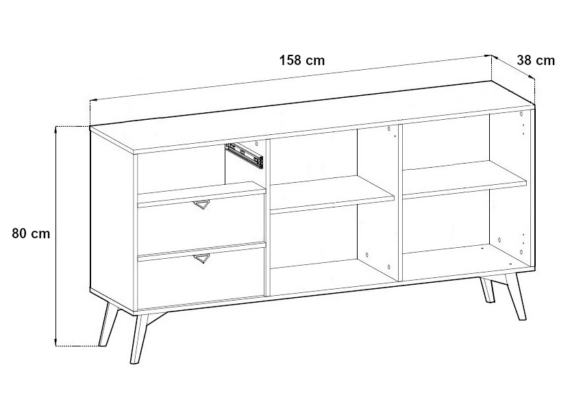 Komoda je vyrobena ze 2 dvířek a 3 zásuvky se systémem plného výsuvu. Použitý systém zvyšuje komfort nábytku. Moderní komoda pro obývací pokoj zaručuje pohodlné a bezproblémové používání a trvanlivost celého nábytku po mnoho let používání.