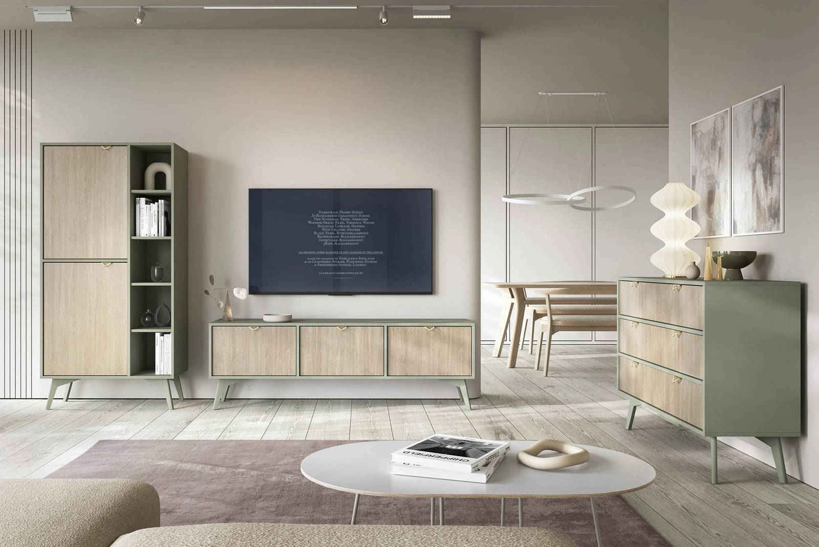 Knihovna Wald 80 cm eukalyptus / béžová rybí kost Skandinávský design stabilní knihovna na vysokých nohách s dvířky do obývacího pokoje vkusný vzor rybí kost