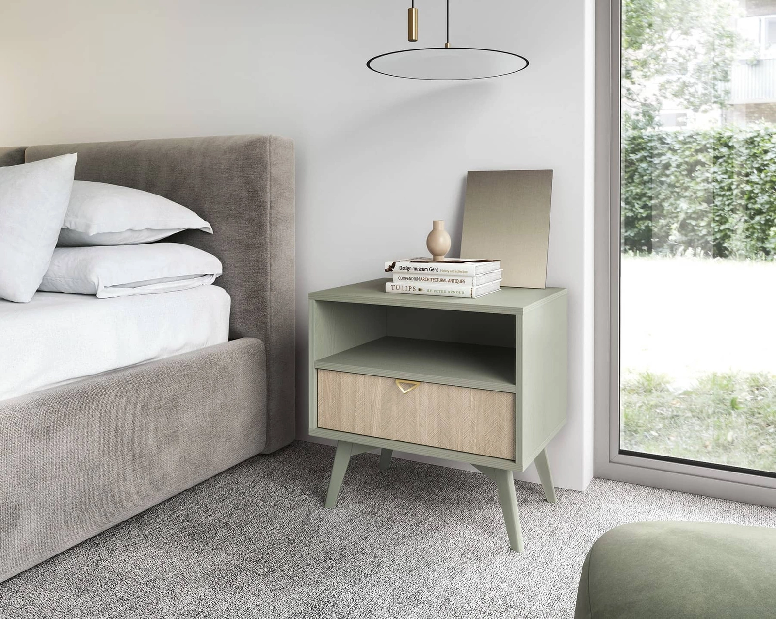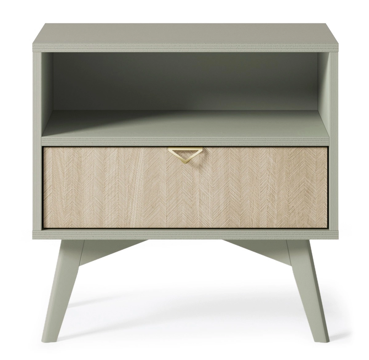 Wald eukalyptus / béžová rybí kost noční stolek se zásuvkou ideální skříňka do ložnice vkusný dekor rybí kosti na čele zásuvky