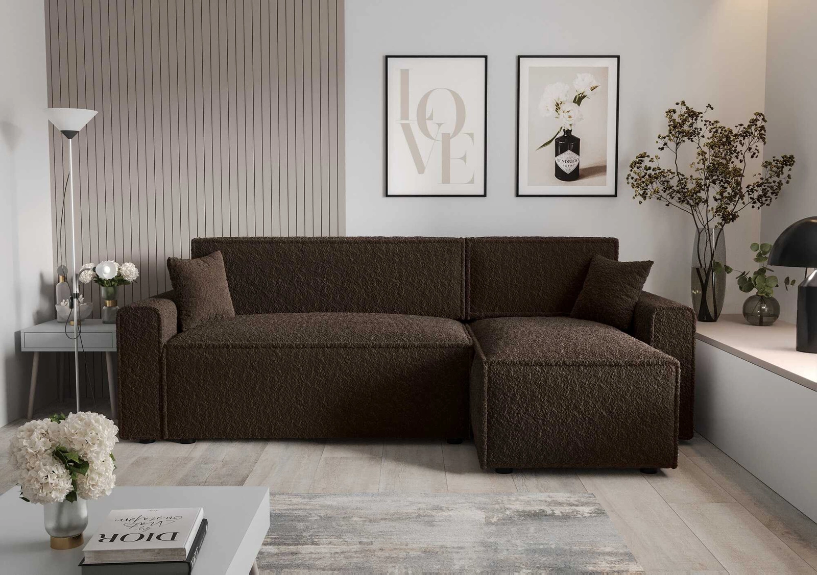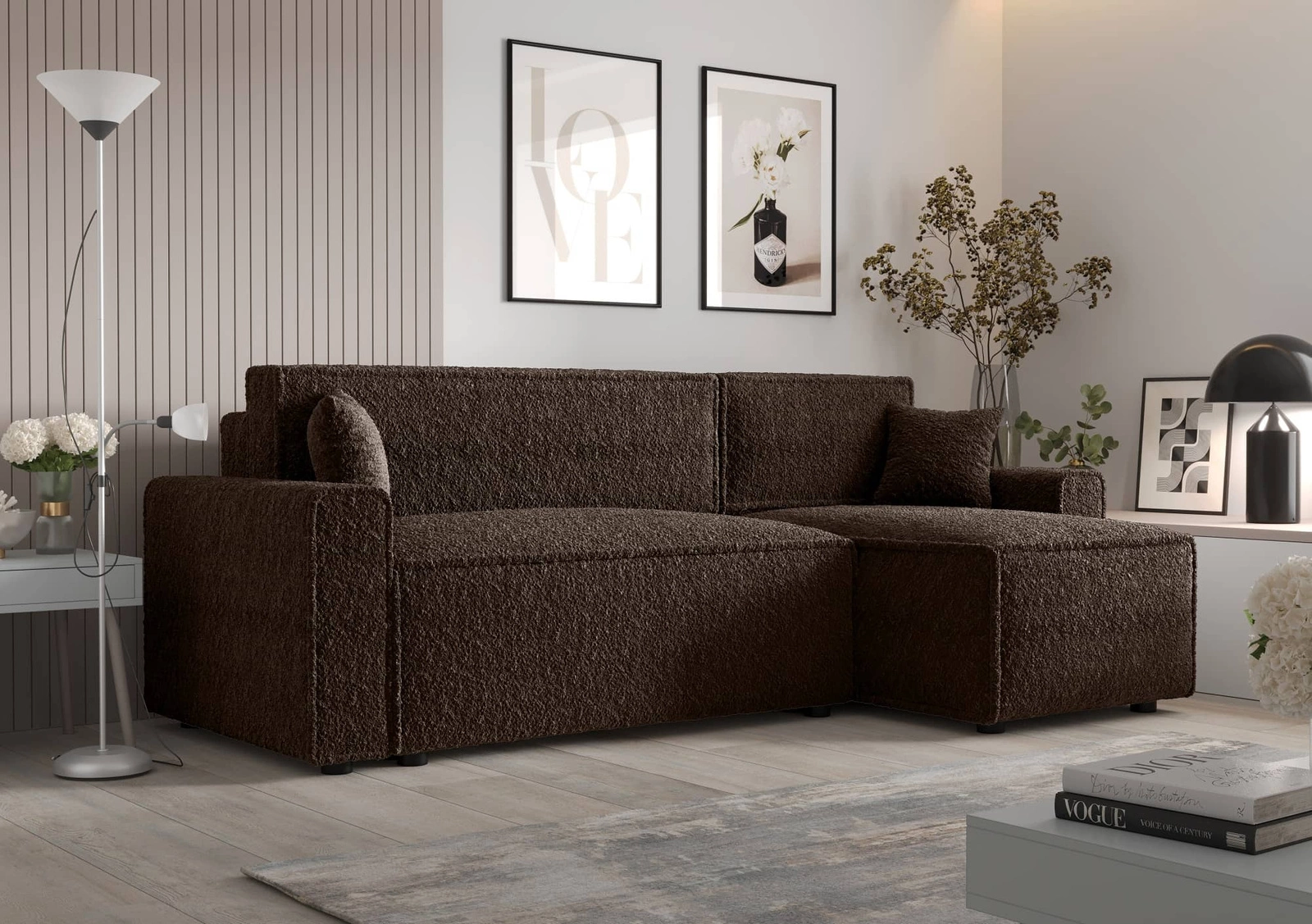Rohová sedací souprava s funkcí spaní Brandon Bis hnědá pravá strana měkká tkanina s charakteristickou smyčkovou povrchovou nádobou na lůžkoviny