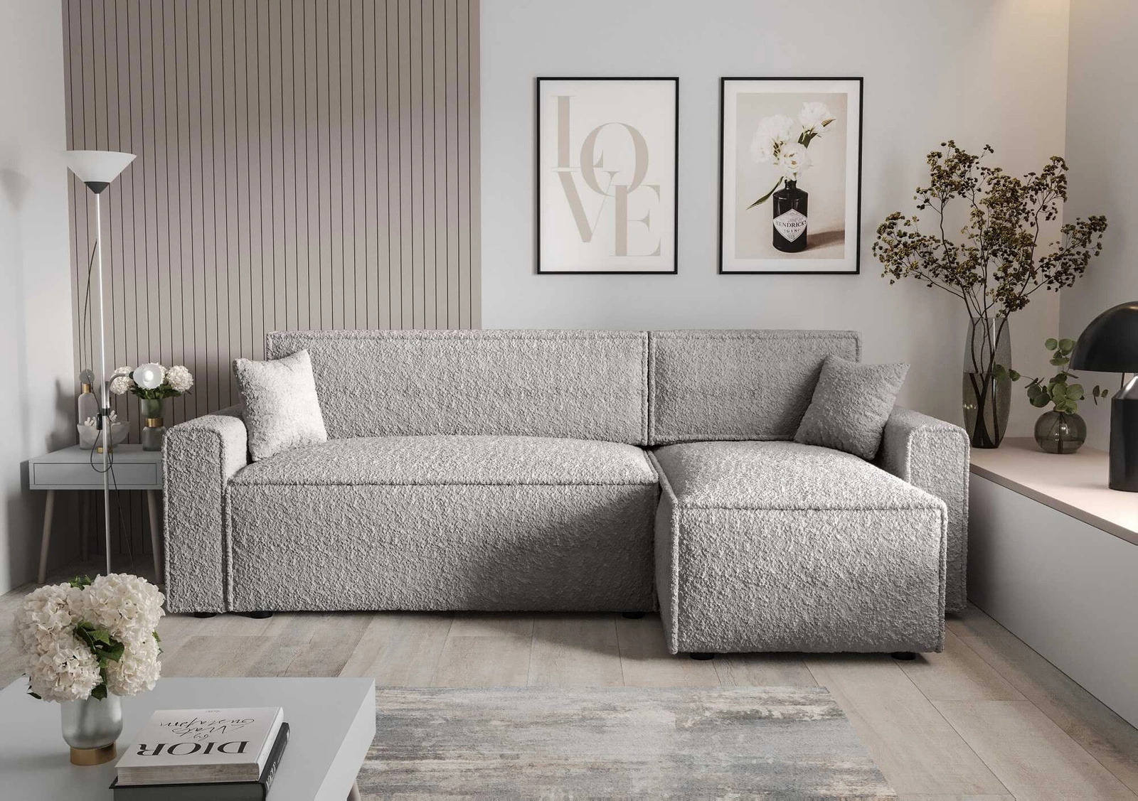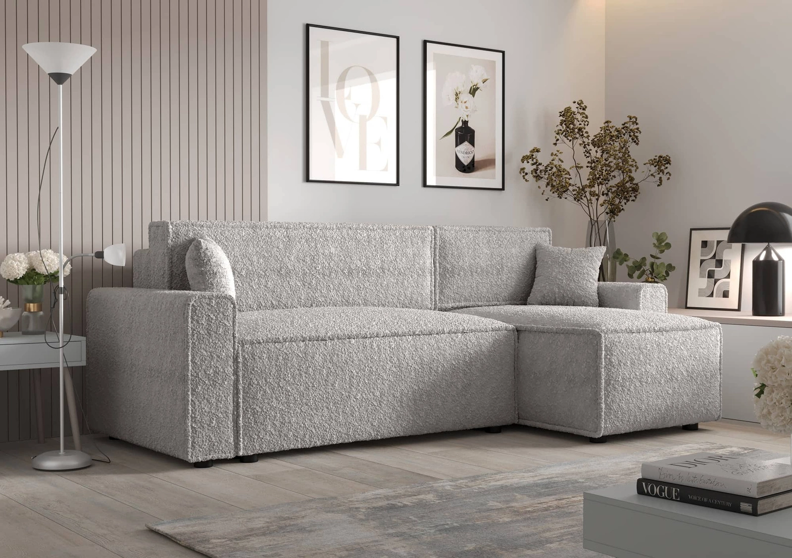Rohová sedací souprava s funkcí spaní Brandon Bis šedý jasan pravá strana měkká látka s charakteristickou smyčkovou povrchovou nádobou na lůžkoviny