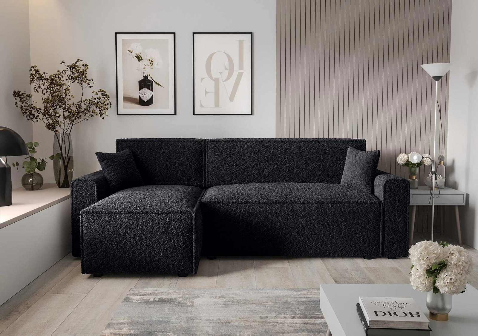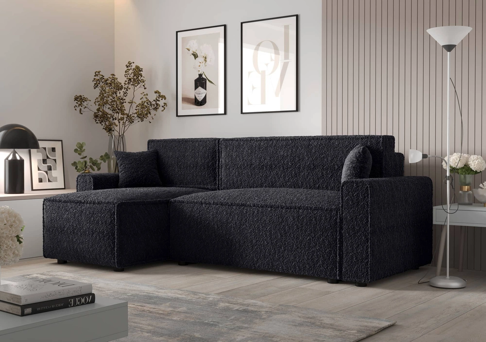 Rohová sedací souprava s funkcí spaní Brandon Bis černá levá strana měkká tkanina s charakteristickou smyčkovou povrchovou nádobou na lůžkoviny