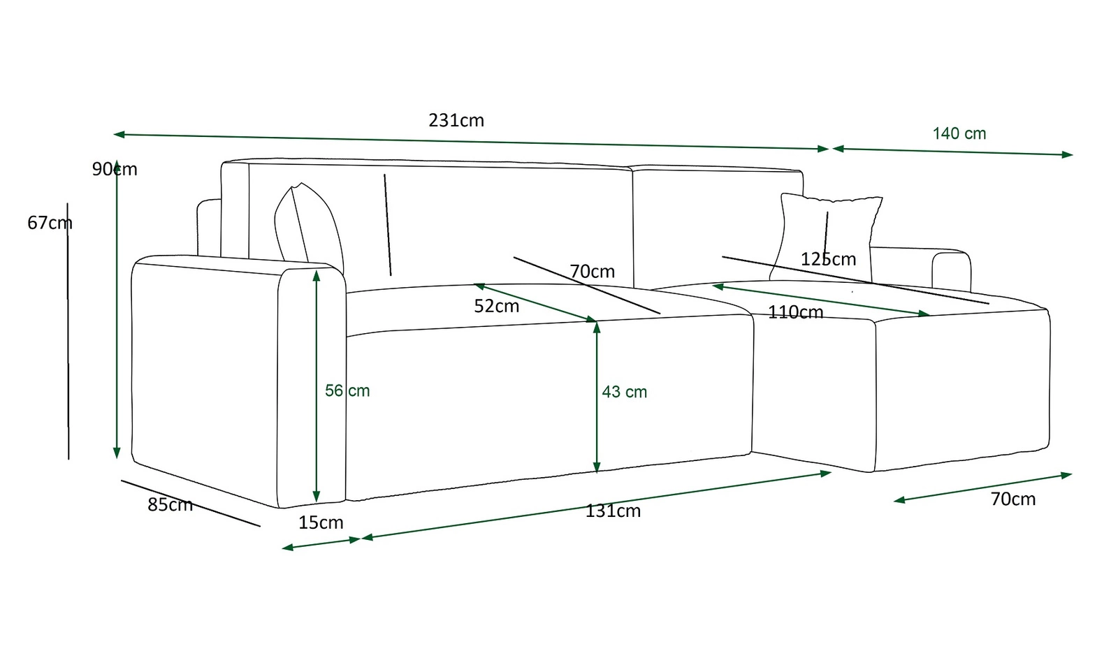 Díky svým optimálním rozměrům a široké funkčnosti je rohová pohovka s funkcí spaní ideální jako rohová pohovka do obývacího pokoje nebo jako rozkládací rohová pohovka do pokoje teenagera. Šířka rohu 231 cm, maximální výška 90 cm a hloubka 140 cm. Spací plocha rohové jednotky je 125x201 cm. Výška sedadla nábytku je 43 cm, a výška opěradla je 47 cm. Vlnité pružiny a pěna HR30 je materiál, z něhož je vyrobeno sedadlo rohu. Podpora polštáře zaručuje pohodlný odpočinek po dlouhém dni, který vy i vaši hosté oceníte při posezení na této jedinečné rohové pohovce!