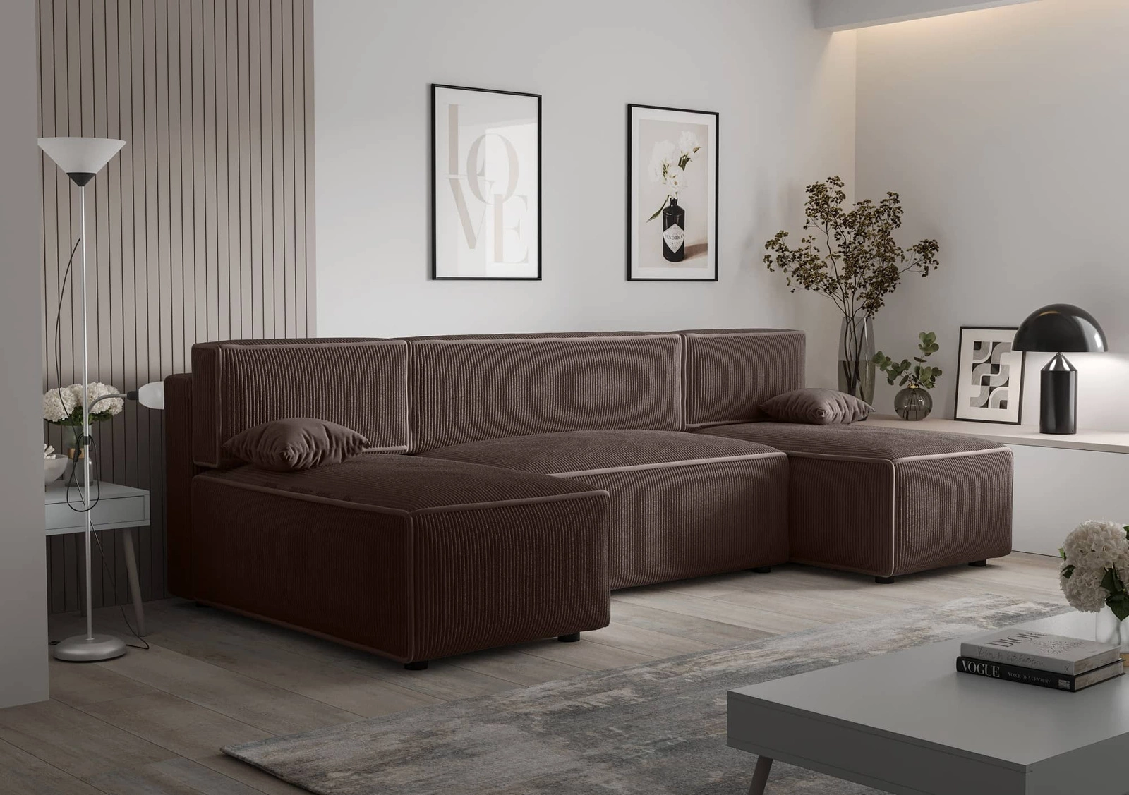 Rohová jednotka s funkcí spaní Brandon U je jednoduchý kus nábytku s moderním designem, který dokonale zapadne do jakéhokoli uspořádání. Pohovka byla celá potažena látkou typu velur Poso 06. Trojrozměrné manšestrová tkanina s výrazným a silným žebrováním dodává pohovce zvláštní charakter a činí ji jedinečně krásnou. Tkanina je velmi měkká a přesto pevná a robustní. Čalounická tkanina Poso je odolnost proti oděru, a také snadno se udržuje v čistotě. Díky tomu bude rohová skládací jednotka Brandon U vypadat esteticky a elegantně po dlouhou dobu. Rohová sedací souprava s funkcí každodenního spaní je vyrobena z vysoce kvalitních materiálů, které jsou odolné vůči vnějším vlivům, jako je čalounění nábytku a různé druhy nárazů.