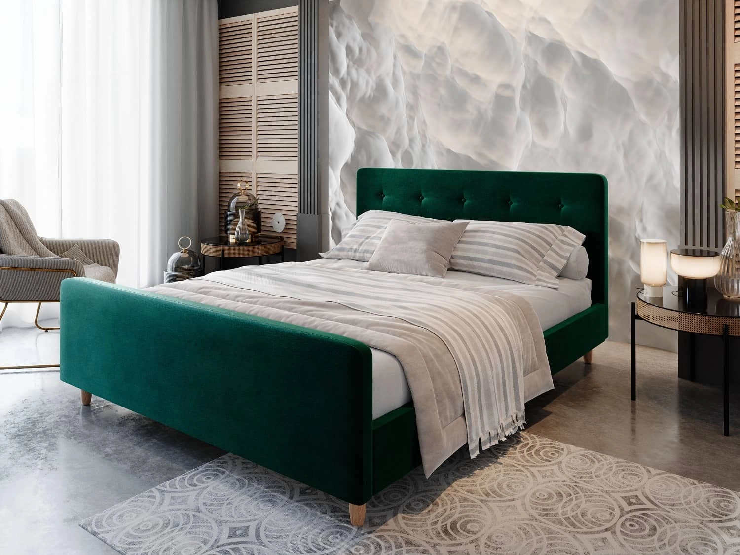 Čalouněná postel Isara 160x200 v lahvově zelené barvě je stylový kus nábytku, který se skvěle hodí do každé ložnice.