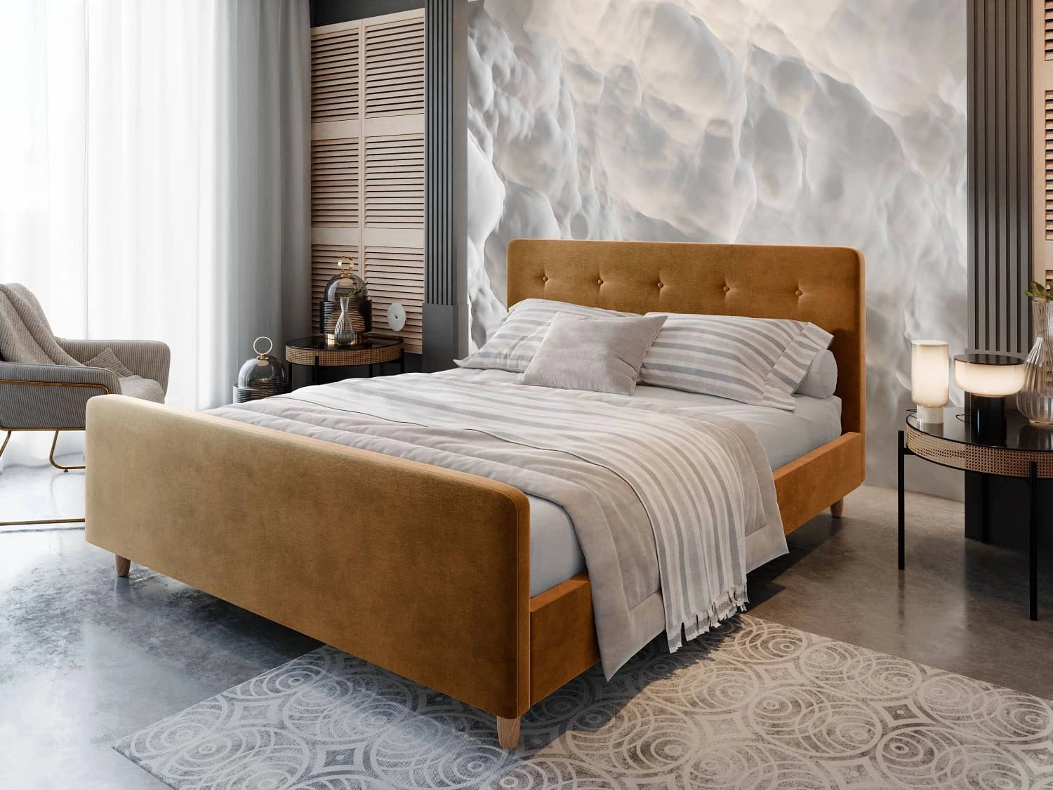 Čalouněná postel Isara 180x200 hořčice s kontejnerem v moderním skandinávském stylu s výrazným čelem a podnožkou