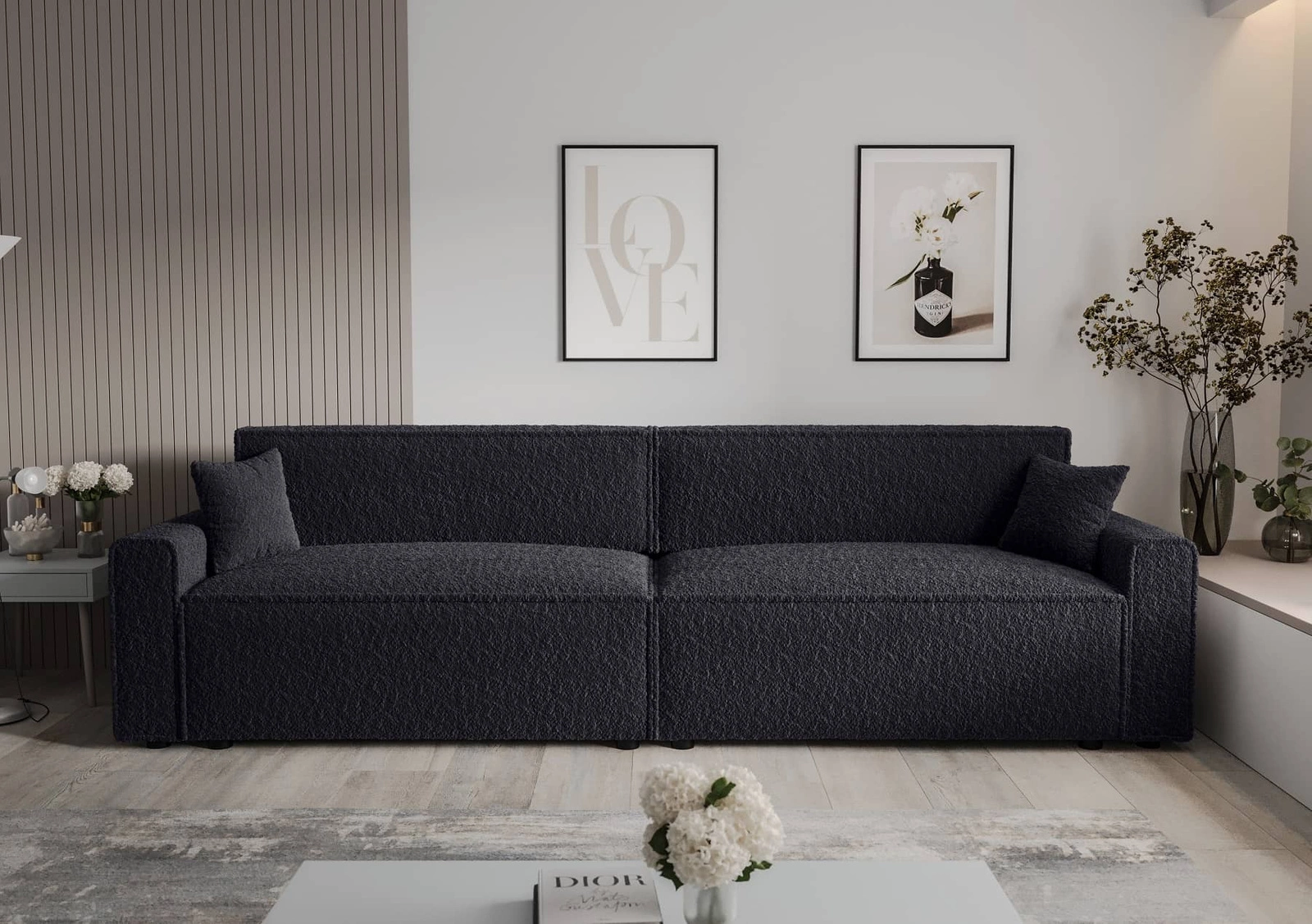 Rozkládací pohovka Brandon XL Bis černá moderní designová tkanina s výrazným smyčkovým povrchem nádoby na lůžkoviny