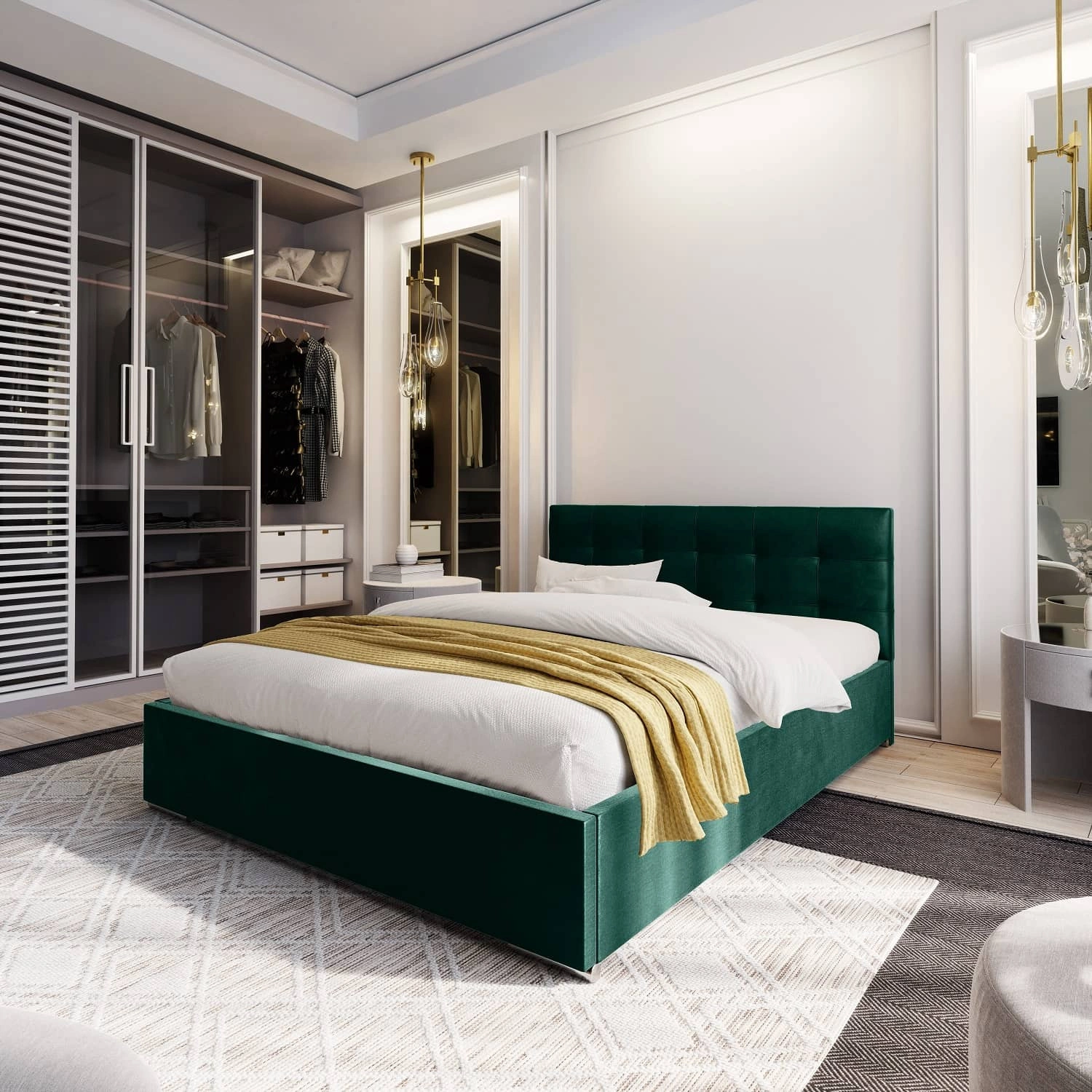 Čalouněná postel Montigo 180x200 lahvově zelená s kontejnerem v moderním skandinávském stylu s prošívaným čelem