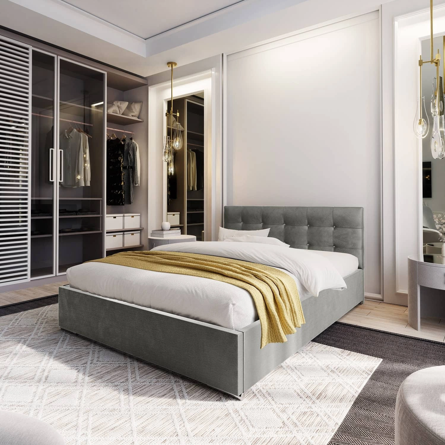 Čalouněná postel Mona 140x200 šedá s úložným boxem v moderním skandinávském stylu s prošívaným podhlavníkem s krystaly