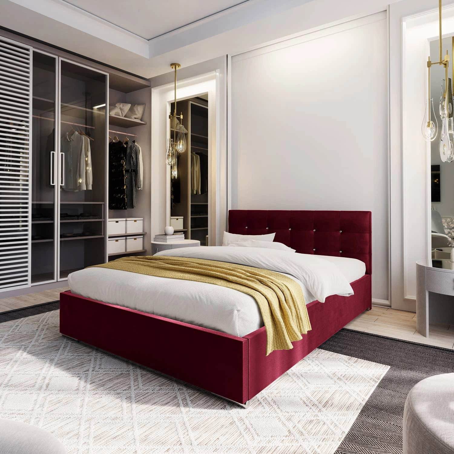 Čalouněná postel Mona 160x200 bordó s úložným boxem v moderním skandinávském stylu s prošívaným podhlavníkem s krystaly