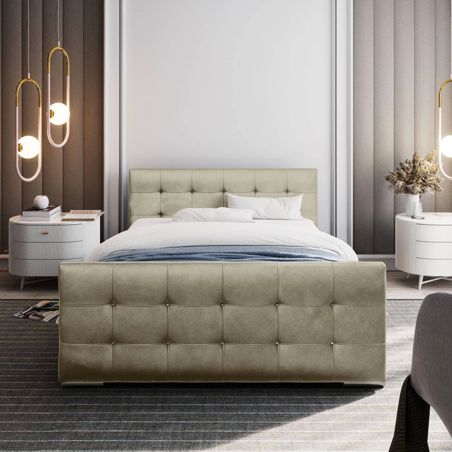 Čalouněná postel Alford 160x200 béžová s kontejnerem v moderním skandinávském stylu s prošívaným podhlavníkem a podnožkou s krystaly