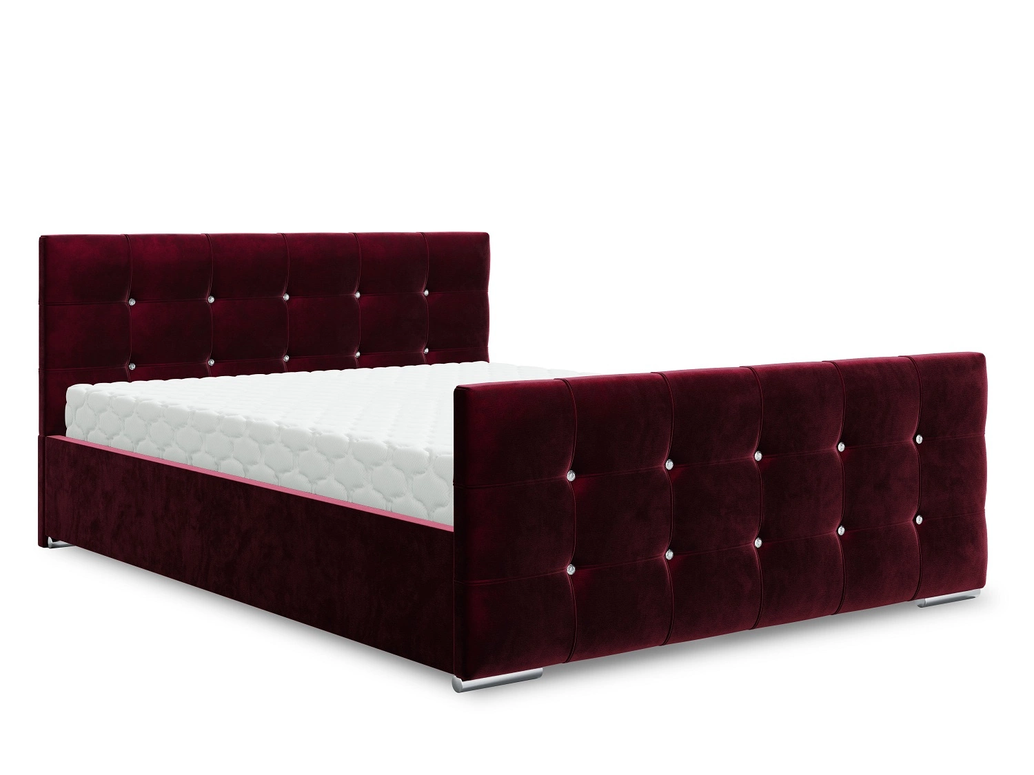 Čalouněná postel Alford 140x200 bordó s úložným boxem v moderním skandinávském stylu s prošívaným čelem a nohama s povrchovou úpravou krystaly