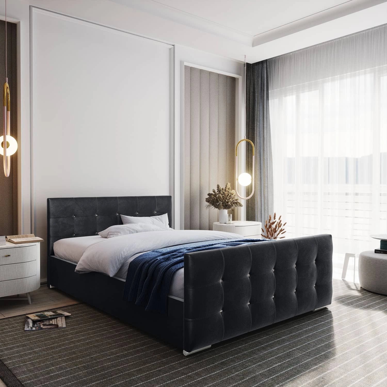 Čalouněná postel Alford 140x200 v grafitové barvě s úložným boxem v moderním skandinávském stylu s prošívaným čelem a nohama s povrchovou úpravou krystaly