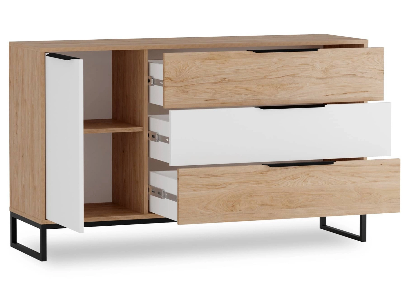 Komoda se zásuvkami Imola 135 cm dub hickory / bílá funkční ideální pro interiéry v industriálním a loftovém stylu stabilní kovová základna