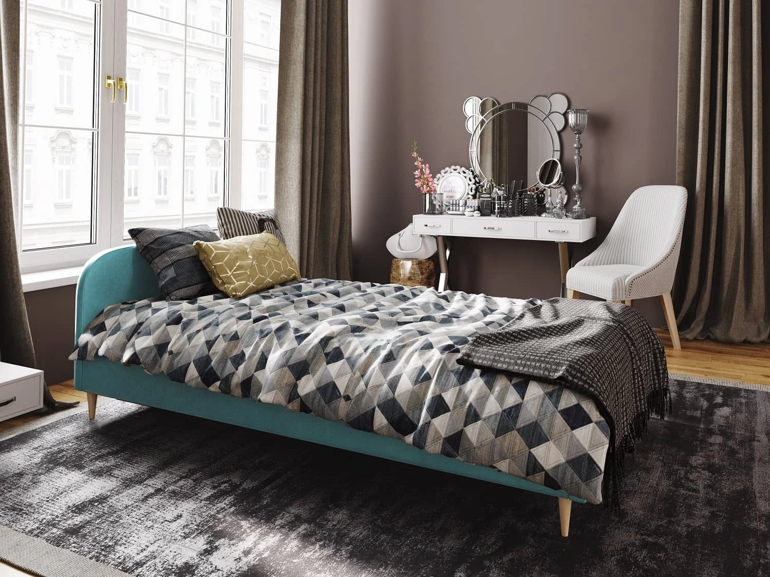 Čalouněná postel Ivrea 90x200 v modré barvě je stylový kus nábytku, který dokonale zapadne do pokoje teenagera nebo malé ložnice.