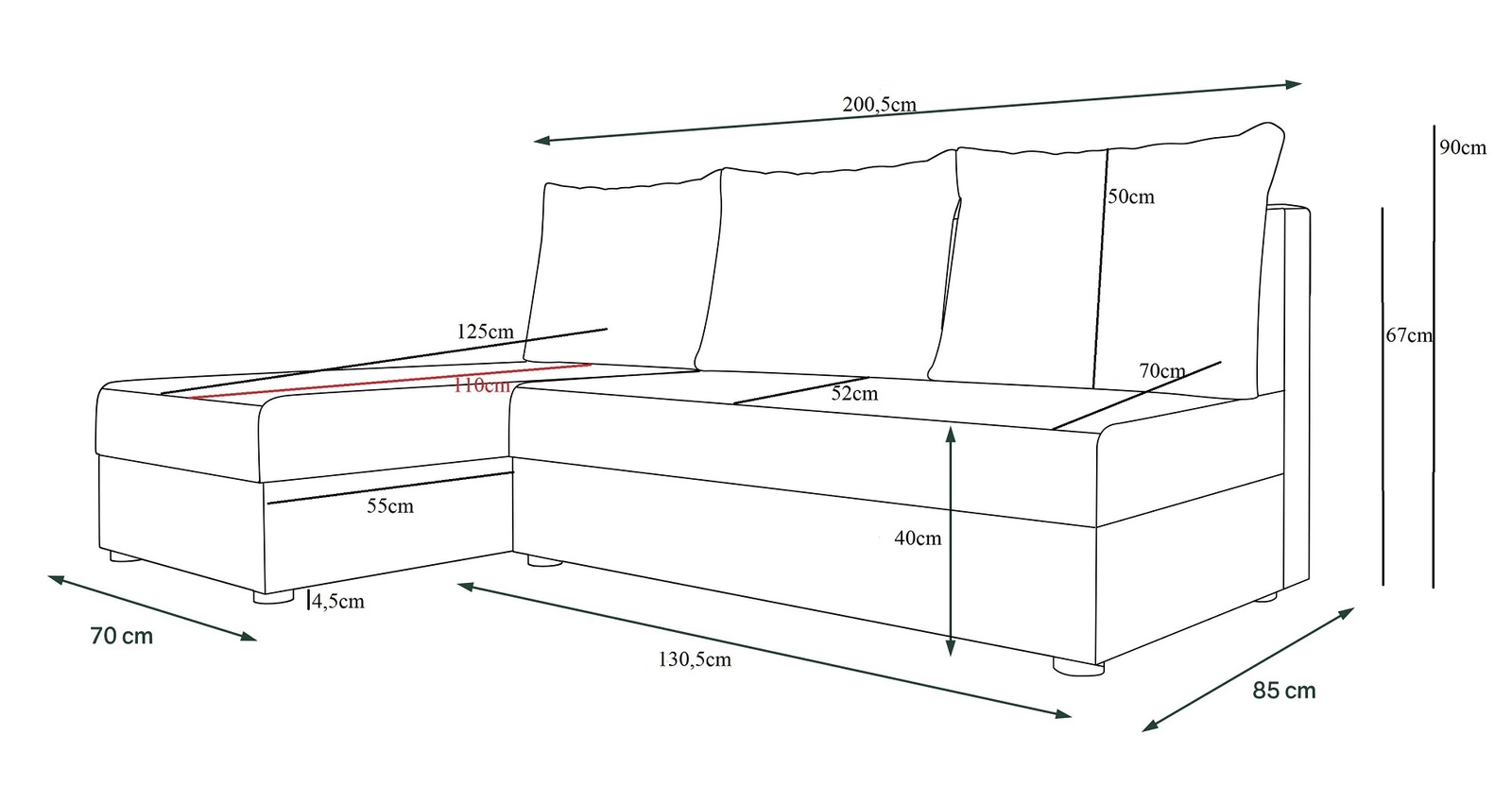 Díky svým optimálním rozměrům a široké funkčnosti je rohová pohovka s funkcí spaní ideální jako rohová pohovka do obývacího pokoje nebo jako rozkládací rohová pohovka do pokoje teenagera. Šířka rohu 200,5 cm, maximální výška 90 cm a hloubka 140 cm. Spací plocha rohové jednotky je 131x201 cm. Výška sedadla nábytku je 40 cm a maximální výška opěradla je 50 cm. Vlnité pružiny a polyuretanová pěna T30 je materiál, z něhož je vyrobeno sedadlo rohu. Zádová opěrka polštáře vyplněné mletou polyuretanovou pěnou zaručuje pohodlný odpočinek po dlouhém dni, který oceníte vy, vaši blízcí i hosté, kteří si na tuto výjimečnou rohovou sedačku sednou!