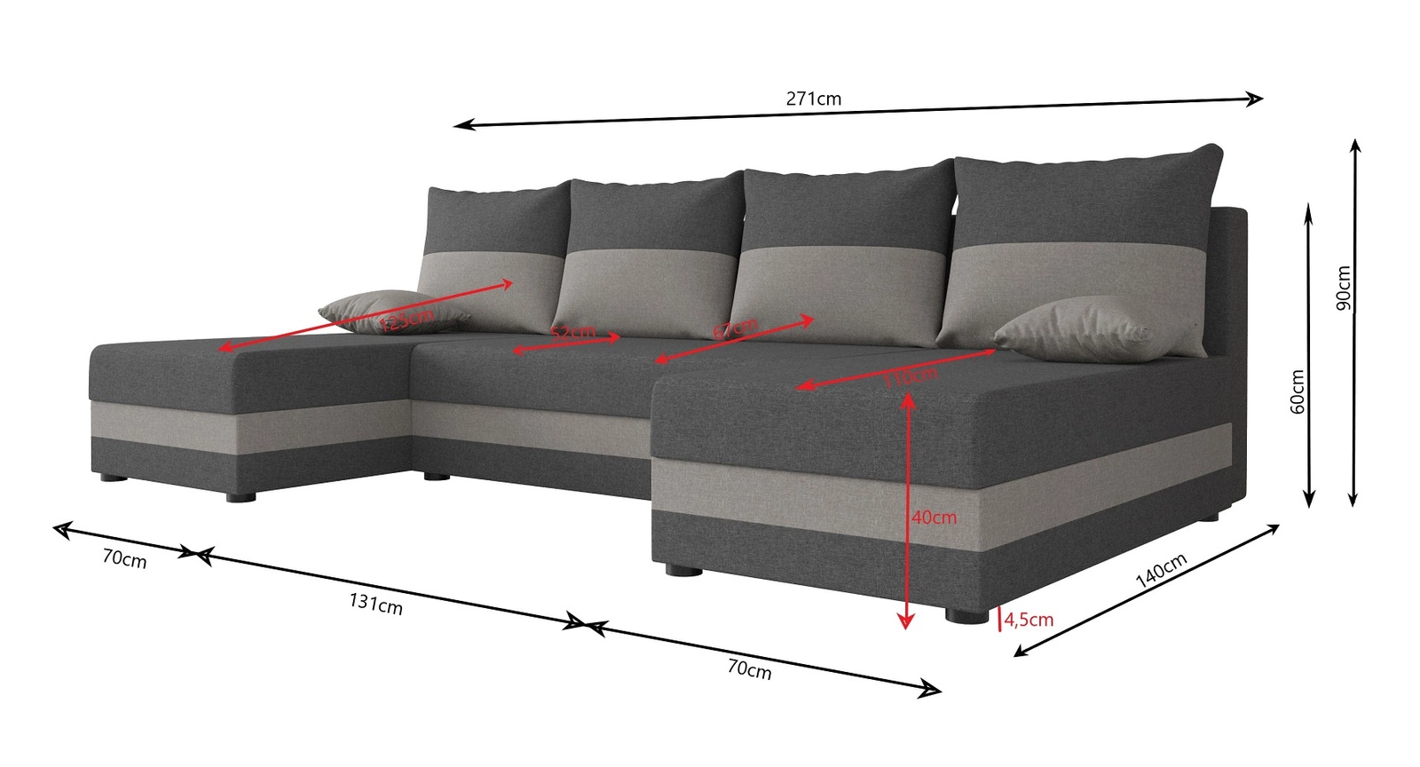 Díky svým optimálním rozměrům a široké funkčnosti je rohová pohovka s funkcí spaní ideální jako rohová pohovka do obývacího pokoje nebo jako rozkládací rohová pohovka do pokoje teenagera. Šířka rohu 271 cm, maximální výška 90 cm a hloubka 140 cm. Spací plocha rohové jednotky je 125x271 cm. Výška sedadla nábytku je 40 cm a maximální výška opěradla je 50 cm. Vlnité pružiny a polyuretanová pěna T30 je materiál, z něhož je vyrobeno sedadlo rohu. Zádová opěrka polštáře vyplněné mletou polyuretanovou pěnou zaručuje pohodlný odpočinek po dlouhém dni, který oceníte vy, vaši blízcí i hosté, kteří si na tuto výjimečnou rohovou sedačku sednou!