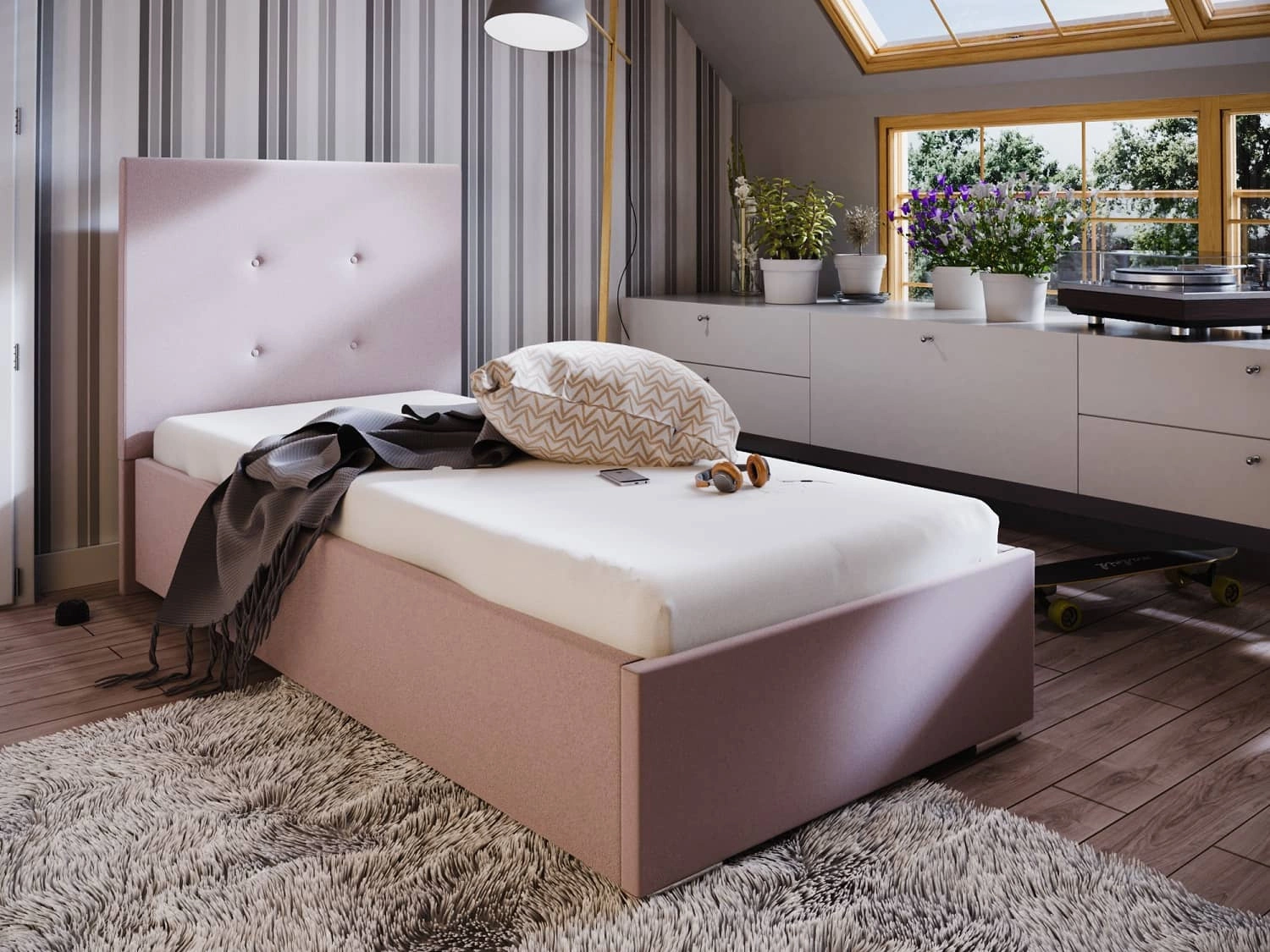 Čalouněná postel Bejar 90x200 v pudrově růžové barvě je stylový kus nábytku, který se skvěle hodí do pokoje teenagera nebo malé ložnice.