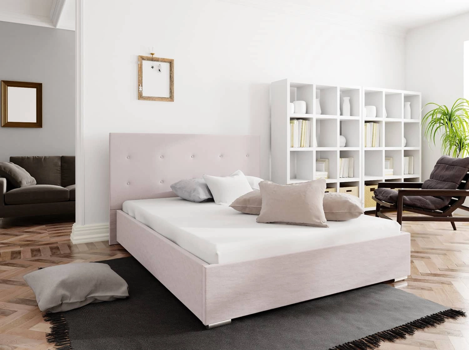 Čalouněná postel Bejar 180x200 v pudrově růžové barvě je ideálním řešením pro ložnice zařízené v moderním nebo klasickém stylu.